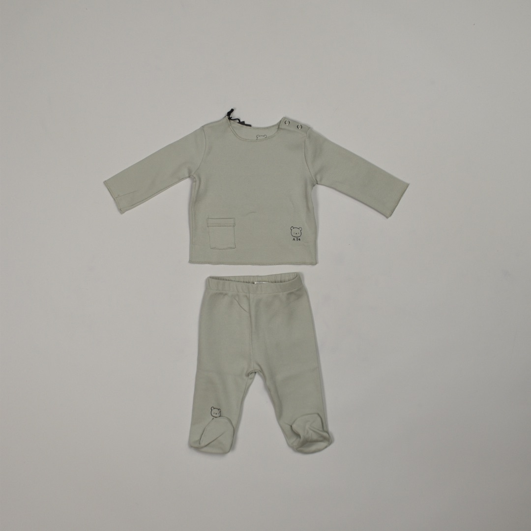 Il set è composto da maglia a maniche lunghe con bottoncini automatici sulla spalla, taschino frontale e piccolo orsetto ricamato, e da pantaloni coordinati con piedini integrati e elastico in vita.
