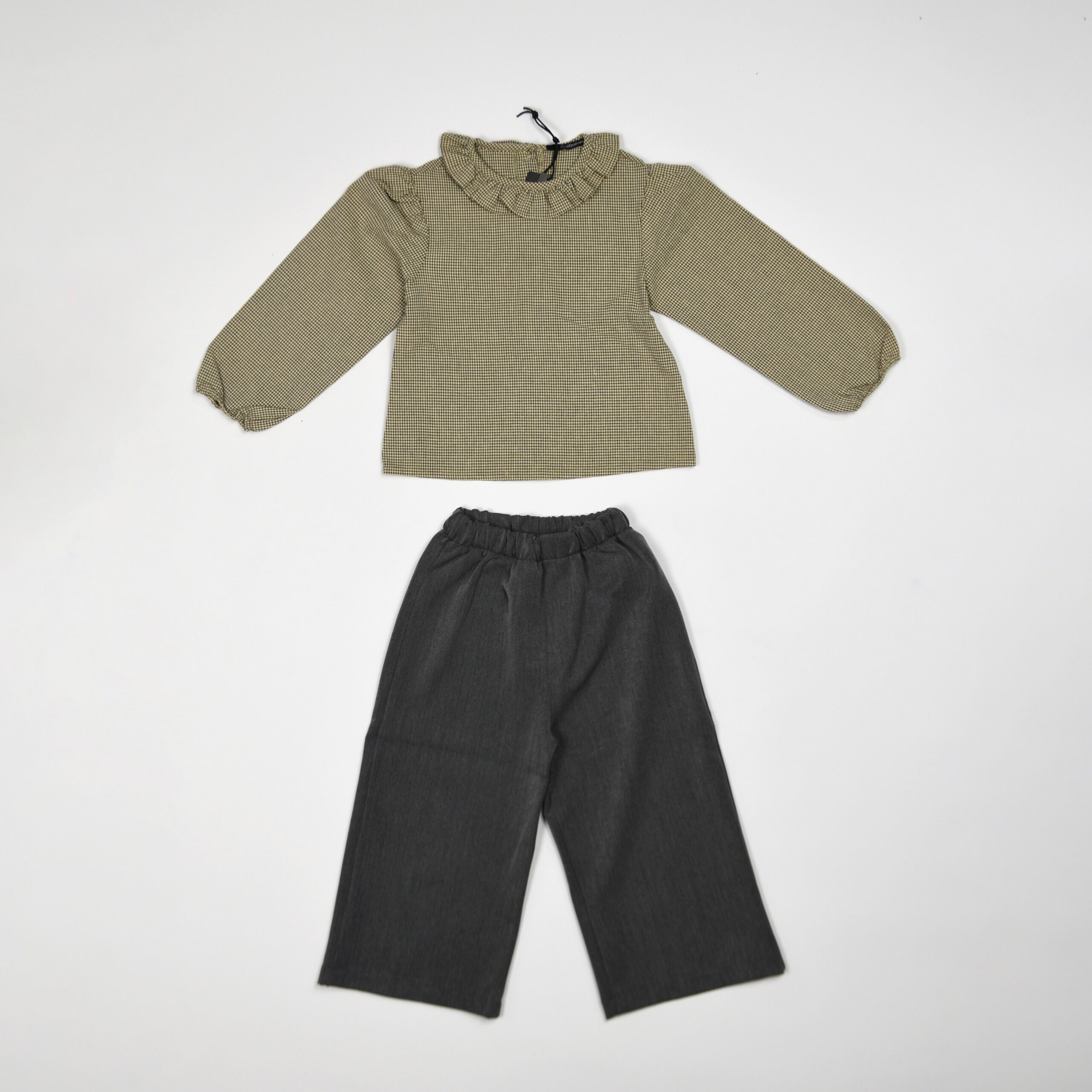 La blusa, dalla fantasia pied de poule nei toni del beige e marrone, presenta maniche lunghe con arricciatura, polsini elastici e romantico colletto volant. I pantaloni, in morbido tessuto antracite, hanno linea ampia e moderna, con vita elasticizzata per un comfort perfetto.
