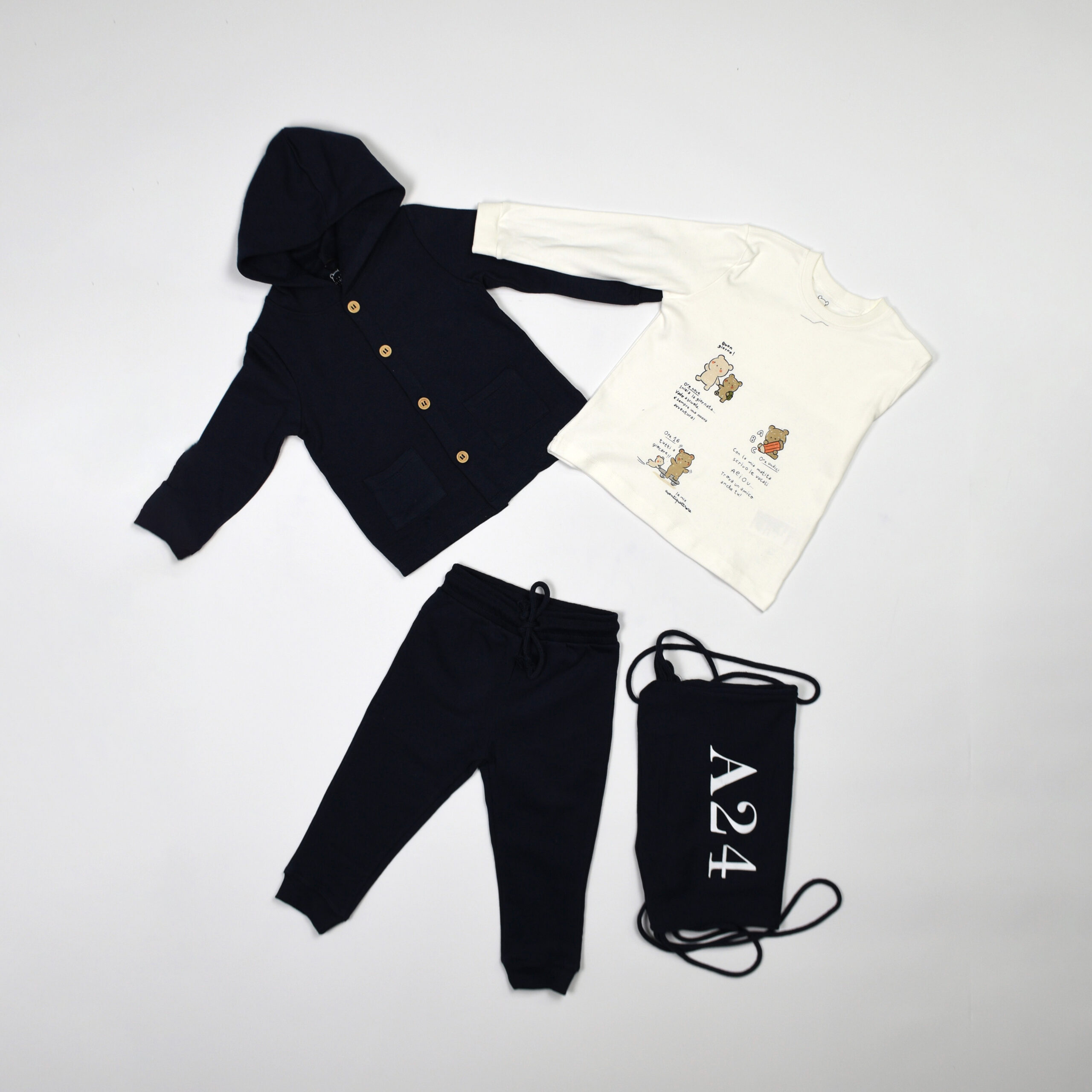 Completo in cotone firmato A24, composto da felpa blu con cappuccio e bottoni in legno, pantaloni jogger con coulisse e t-shirt bianca a manica lunga con stampa orsetti. Inclusa la sacca coordinata con logo.