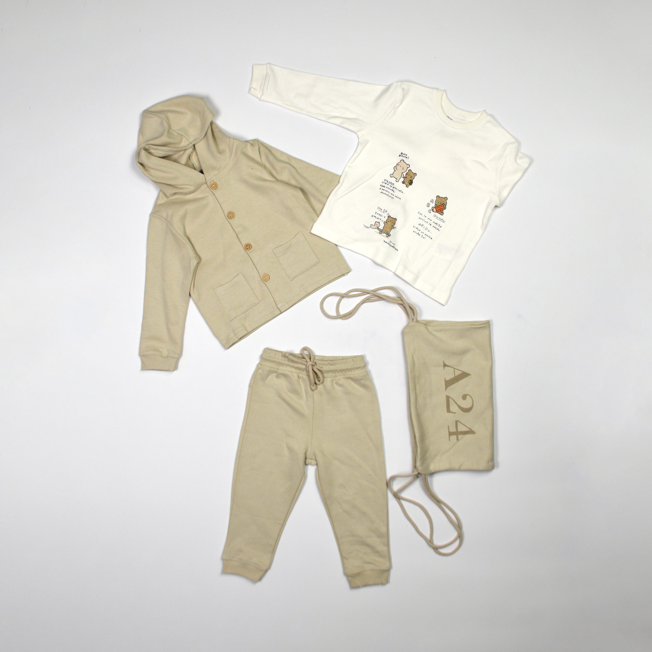 Completo in cotone firmato A24, composto da felpa con cappuccio e bottoni in legno, pantaloni jogger con coulisse e t-shirt bianca a manica lunga con stampa tenera a tema orsetti. Inclusa la pratica sacca coordinata con logo.