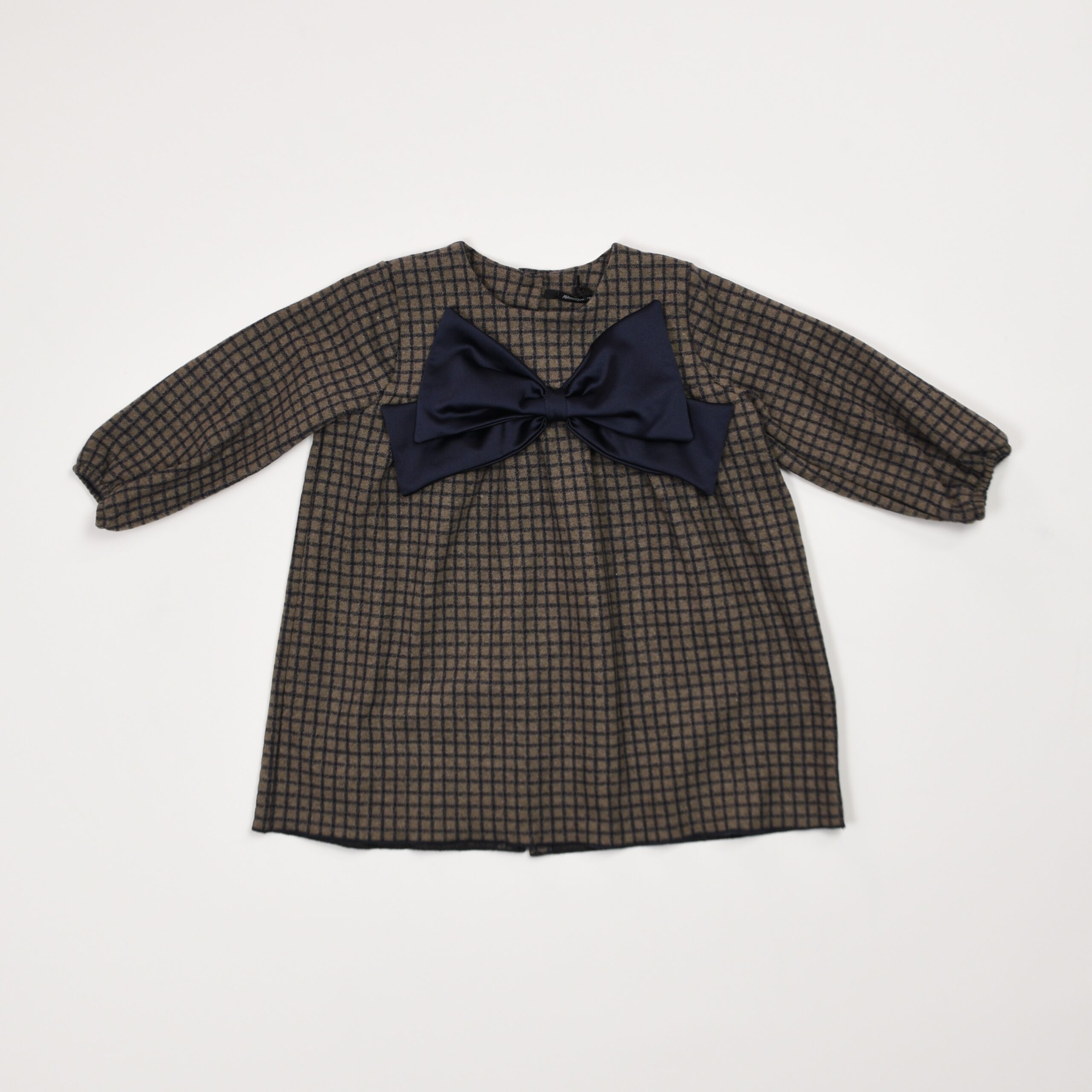 Elegante abito a quadri nei toni del marrone e blu, impreziosito da un maxi fiocco in raso blu applicato sul davanti che dona un tocco raffinato e scenografico. Le maniche lunghe con polsino elasticizzato garantiscono comfort e praticità, mentre il taglio morbido assicura una vestibilità piacevole. Un capo perfetto per look sofisticati e occasioni speciali della stagione.