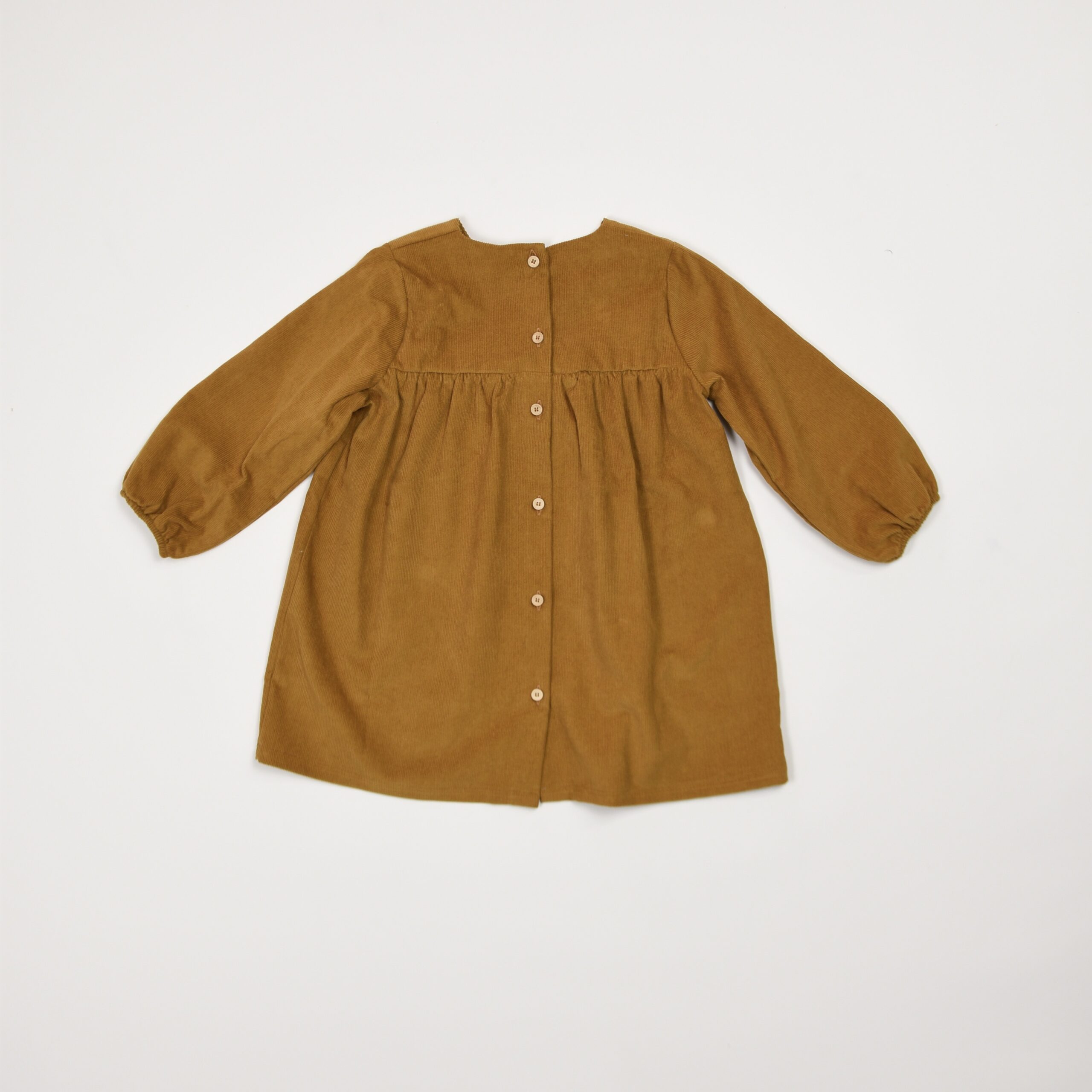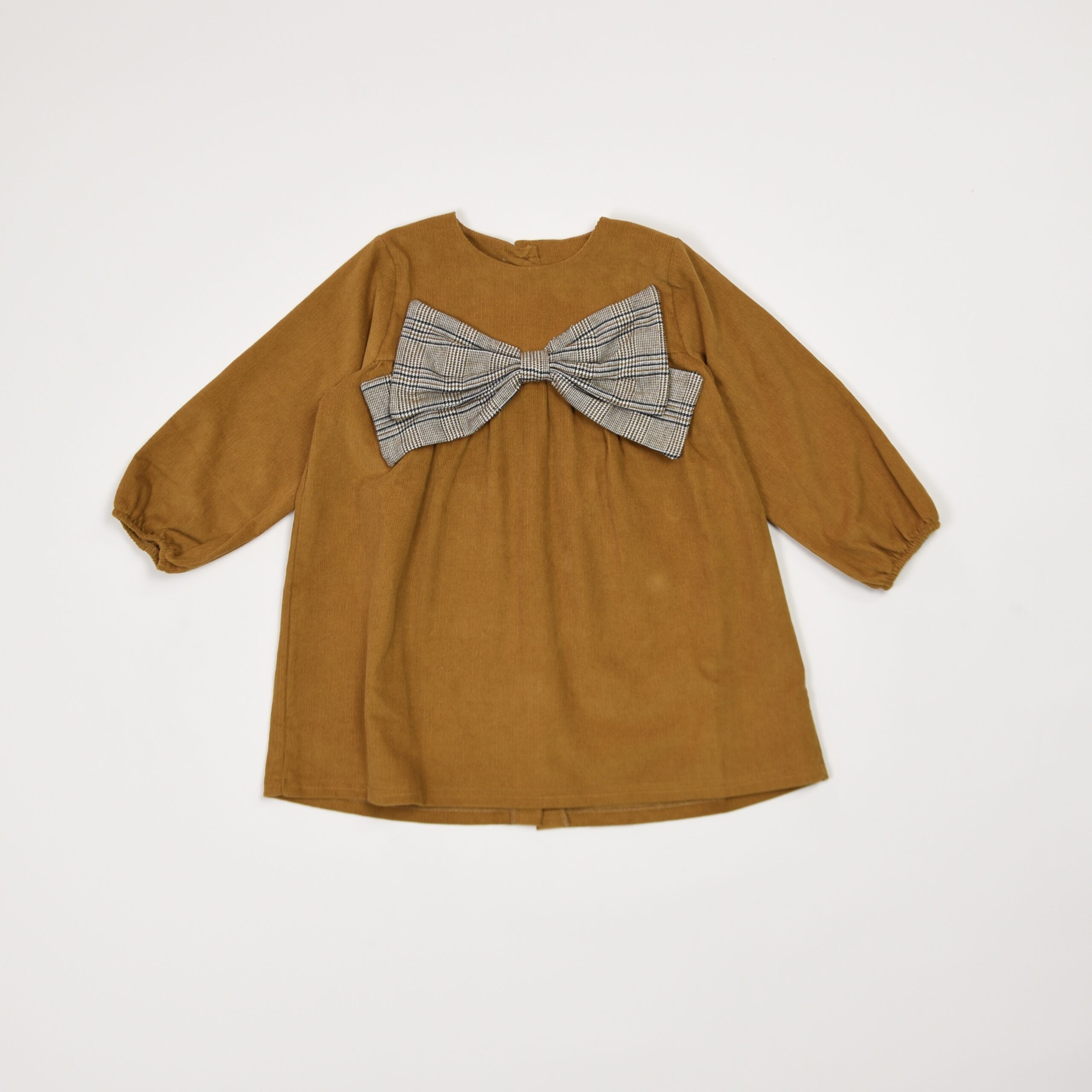 Delizioso abito in velluto color caramello, caratterizzato da maniche lunghe con polsino elastico e da un maxi fiocco applicato sul davanti in tessuto tartan bianco e nero, che dona un tocco elegante e ricercato. Il retro è impreziosito da una fila di bottoncini in tono, che facilitano la chiusura e aggiungono stile al capo. Un vestitino raffinato e comodo, perfetto per le occasioni speciali della stagione.