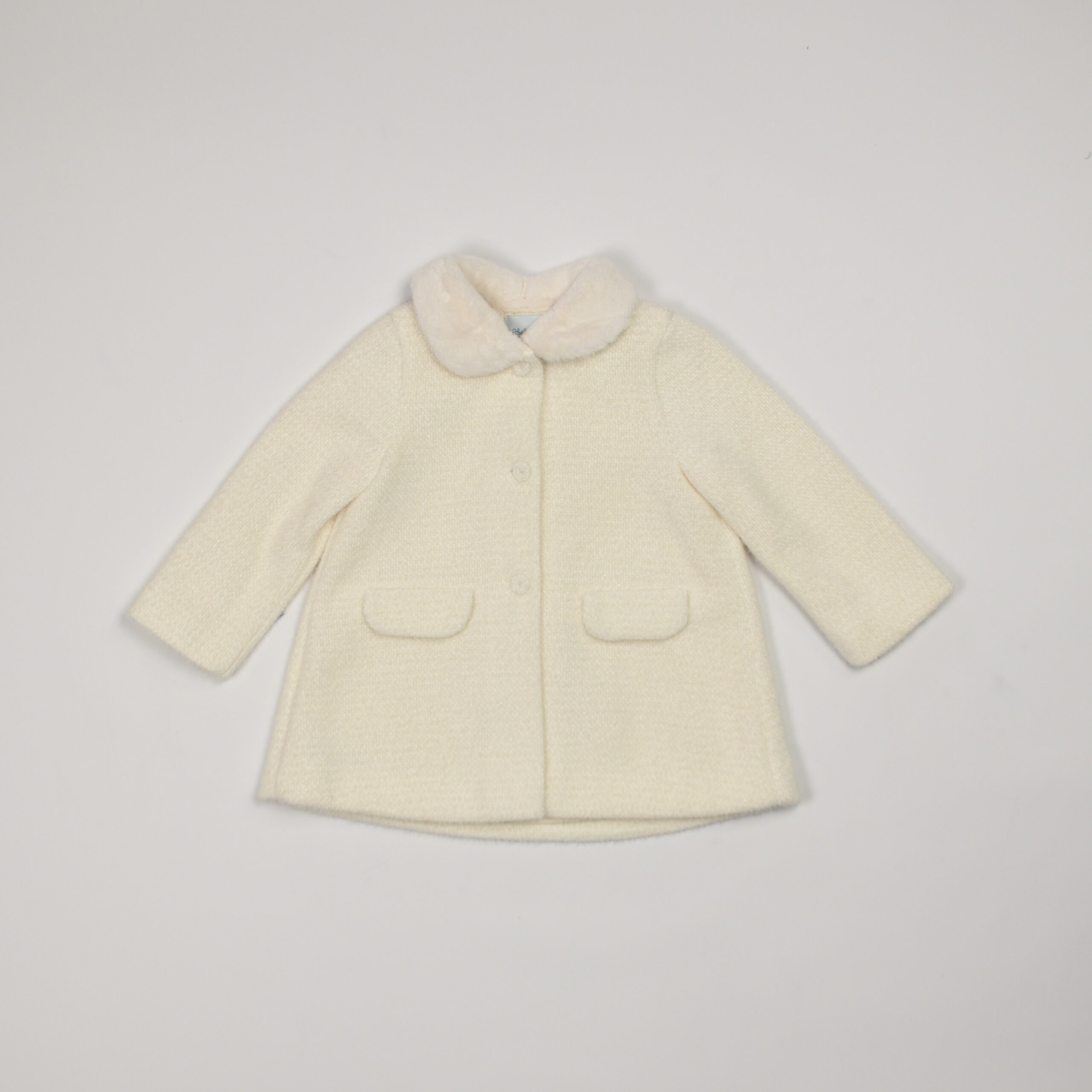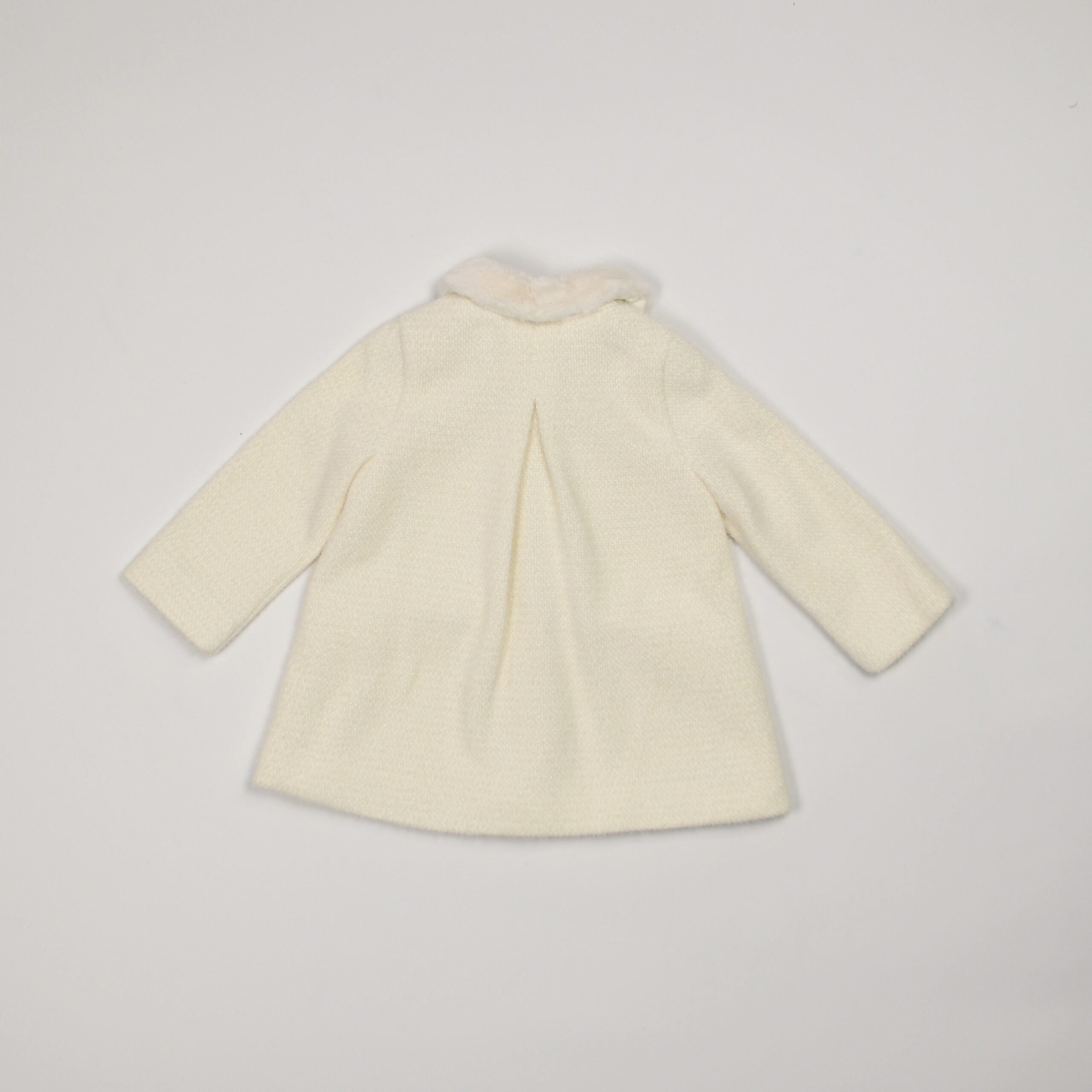 Elegante cappottino in lana bouclé color panna con collo rifinito in morbido ecopelliccia tono su tono. Modello a manica lunga con tasche frontali applicate e chiusura con bottoni. Linea svasata sul retro con piega centrale per maggiore comodità. Perfetto per le occasioni speciali della stagione invernale.