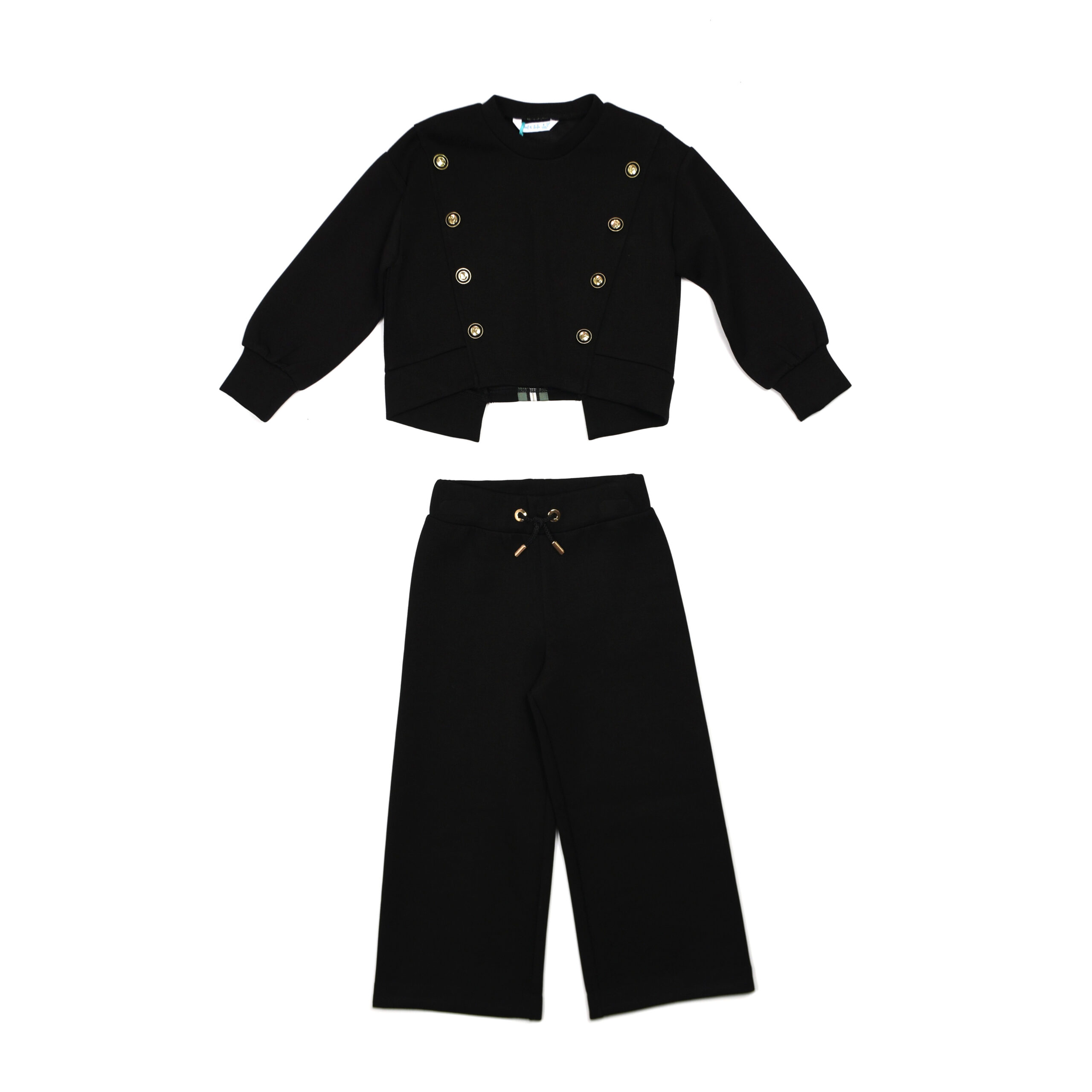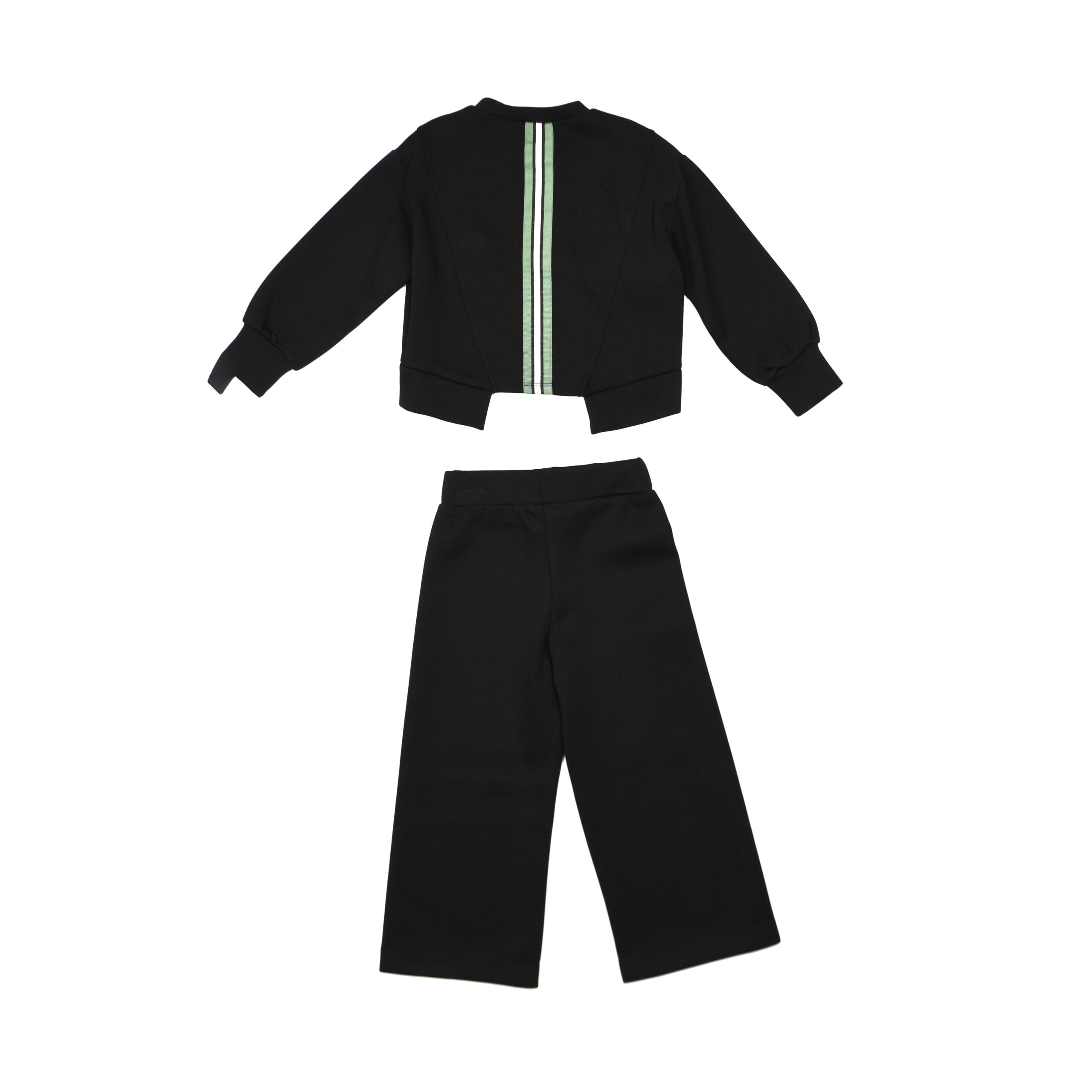 La felpa nera a maniche lunghe è arricchita da una doppia fila di bottoni dorati sul davanti e da un dettaglio a righe verticali verde e bianco sul retro, che dona un tocco moderno.