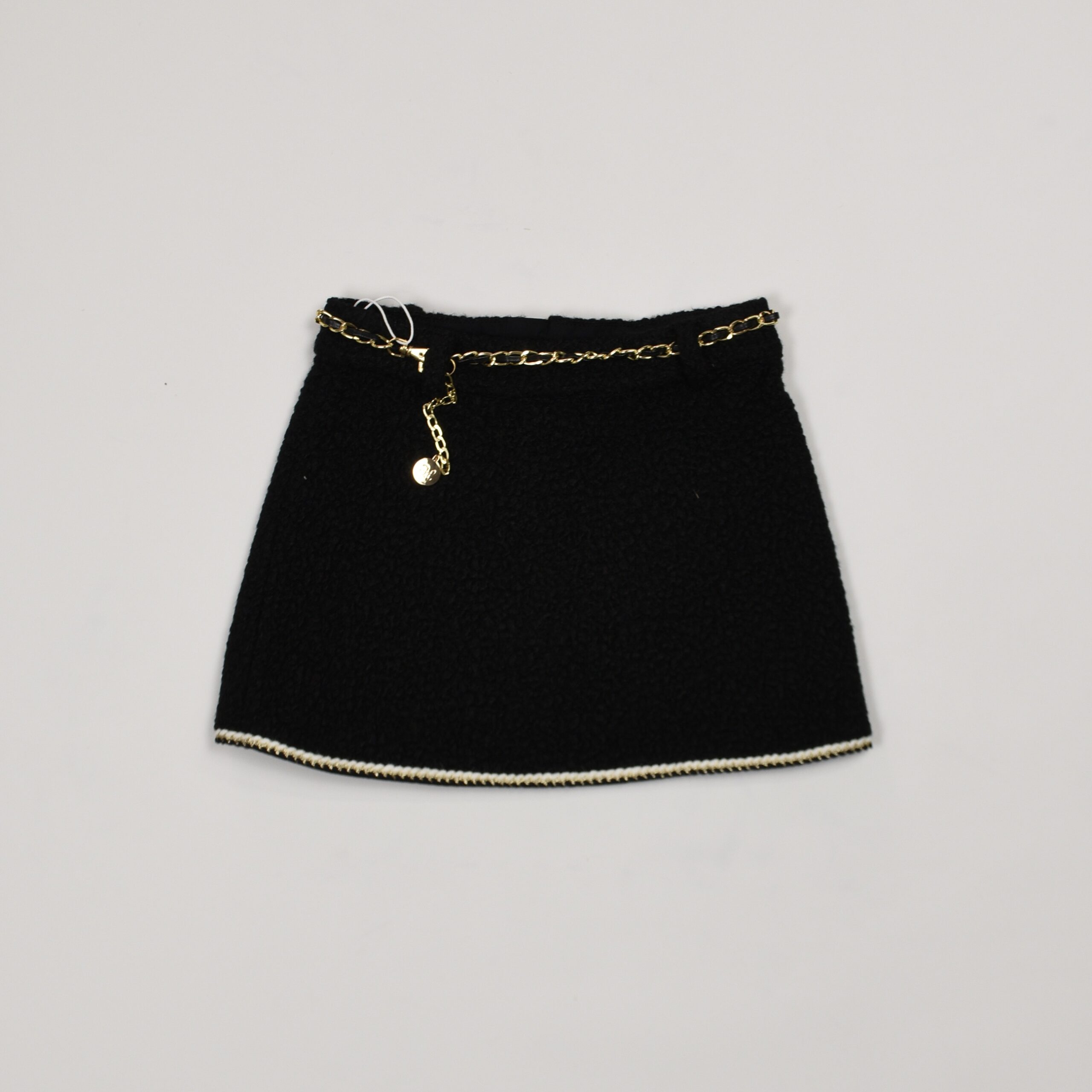 Impreziosita da una raffinata cintura in catena dorata e dettaglio di bordo inferiore a contrasto, si distingue per lo stile curato e moderno.