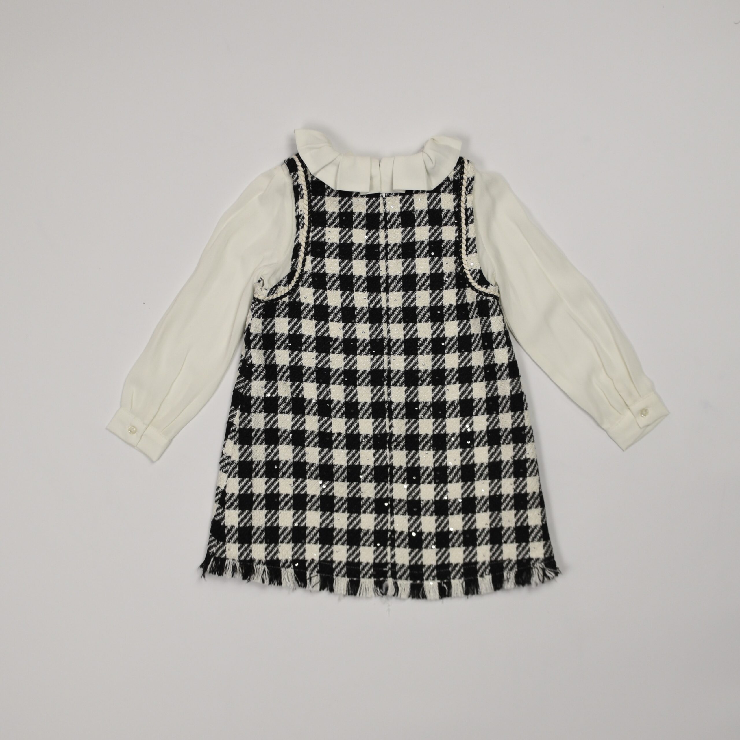 Abito elegante composto da blusa bianca a manica lunga con colletto arricciato e gilet in tweed a quadri bianco e nero integrato. Modello svasato con dettagli sfrangiati sul fondo e chiusura posteriore con zip. Un capo raffinato e ricercato, perfetto per le occasioni speciali della stagione autunno/inverno.