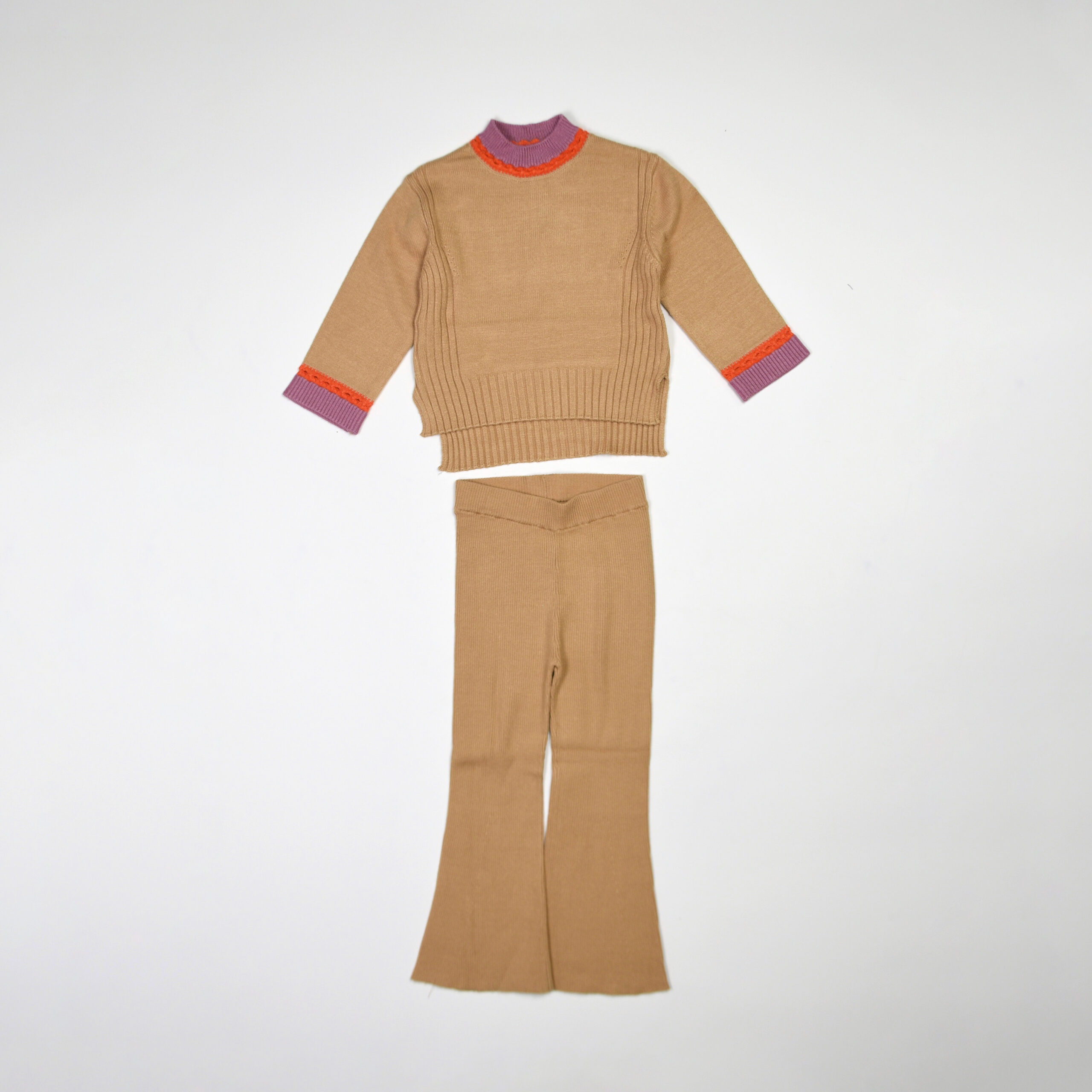 Completo firmato Abel & Lula, composto da maglia a maniche lunghe e pantaloni a zampa. La maglia in maglia fine color cammello chiaro è impreziosita da dettagli in contrasto arancione e fucsia su collo e polsini, che donano un tocco vivace e originale. I pantaloni coordinati, nello stesso tono cammello, presentano una linea svasata sul fondo per un effetto elegante e moderno.