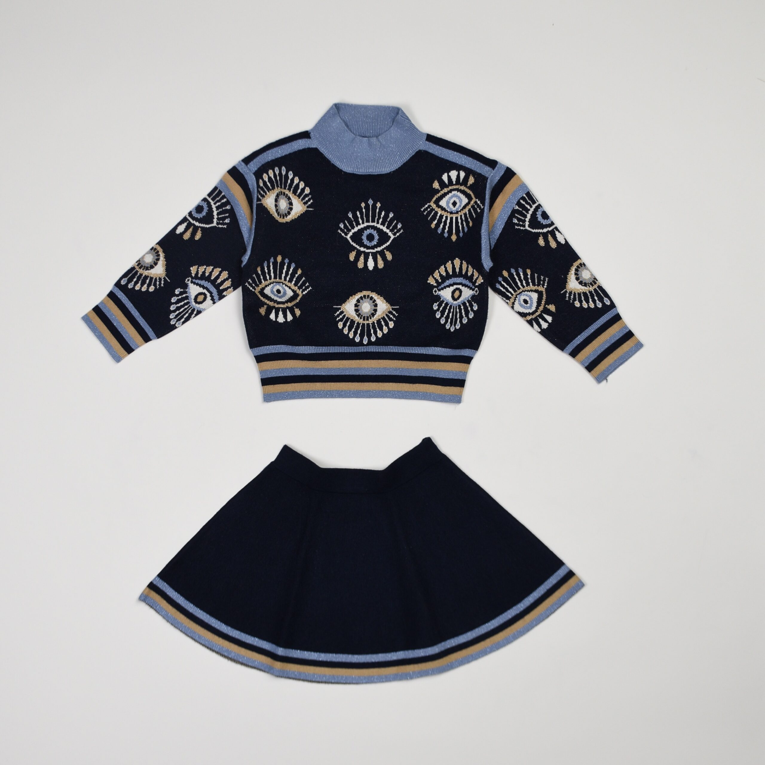 Completo firmato Abel & Lula composto da maglia a maniche lunghe e gonna a ruota. La maglia in blu navy presenta un originale motivo jacquard con occhi stilizzati nei toni dell’azzurro e dell’oro, con dettagli a righe sui polsini e sull’orlo. La gonna, in tinta coordinata, è rifinita con bordi a righe azzurro e oro che richiamano la maglia.