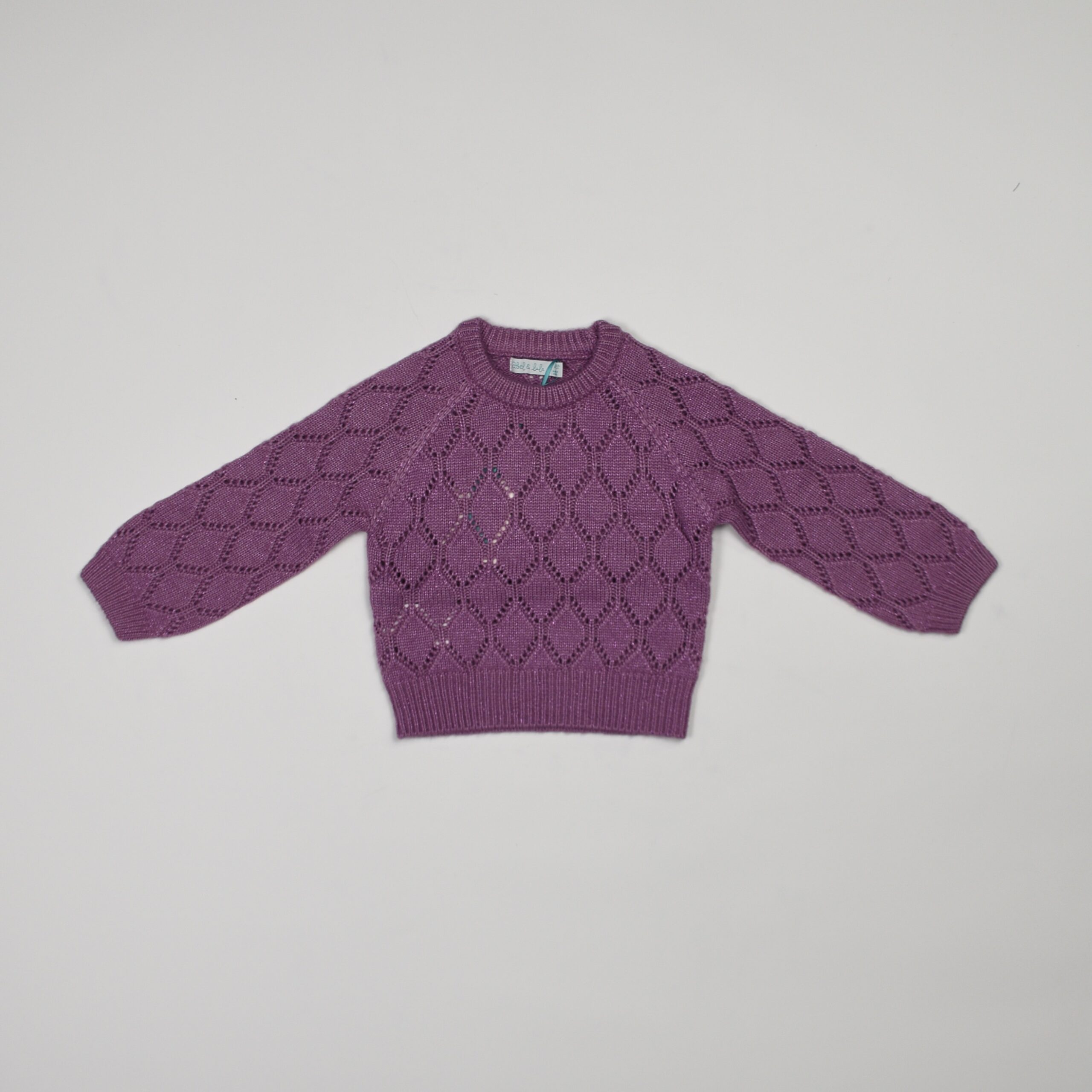 Maglia Abel & Lula in colore viola, caratterizzata da lavorazione traforata a motivo geometrico. Modello a maniche lunghe, con scollo tondo e bordo a costine su polsini e fondo.