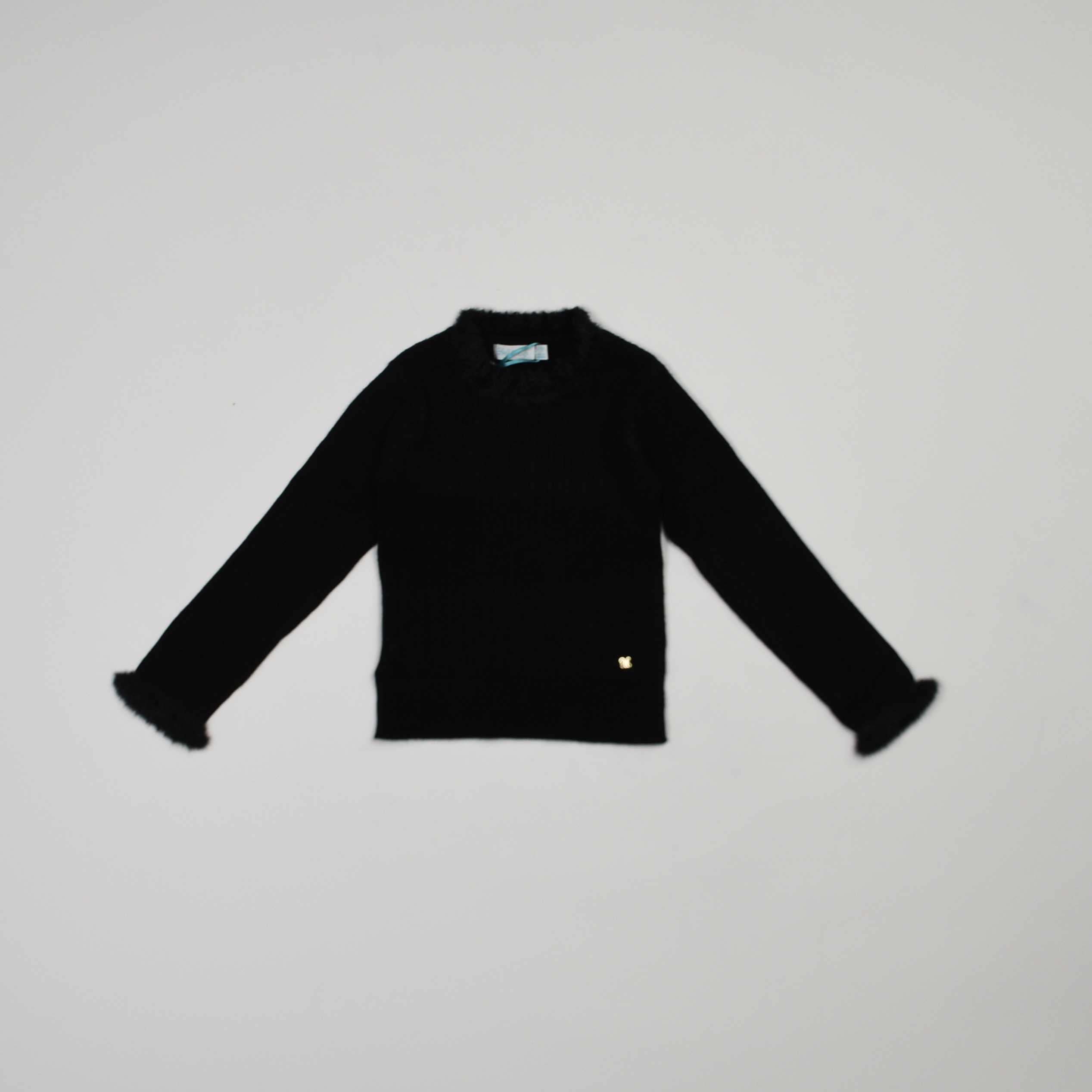 Maglia a maniche lunghe Abel & Lula in colore panna, disponibile anche in nero. Modello girocollo a costine con polsini e collo rifiniti in morbida pelliccia tono su tono. Logo dorato applicato sul fondo. Un capo elegante e confortevole, perfetto per le occasioni speciali.