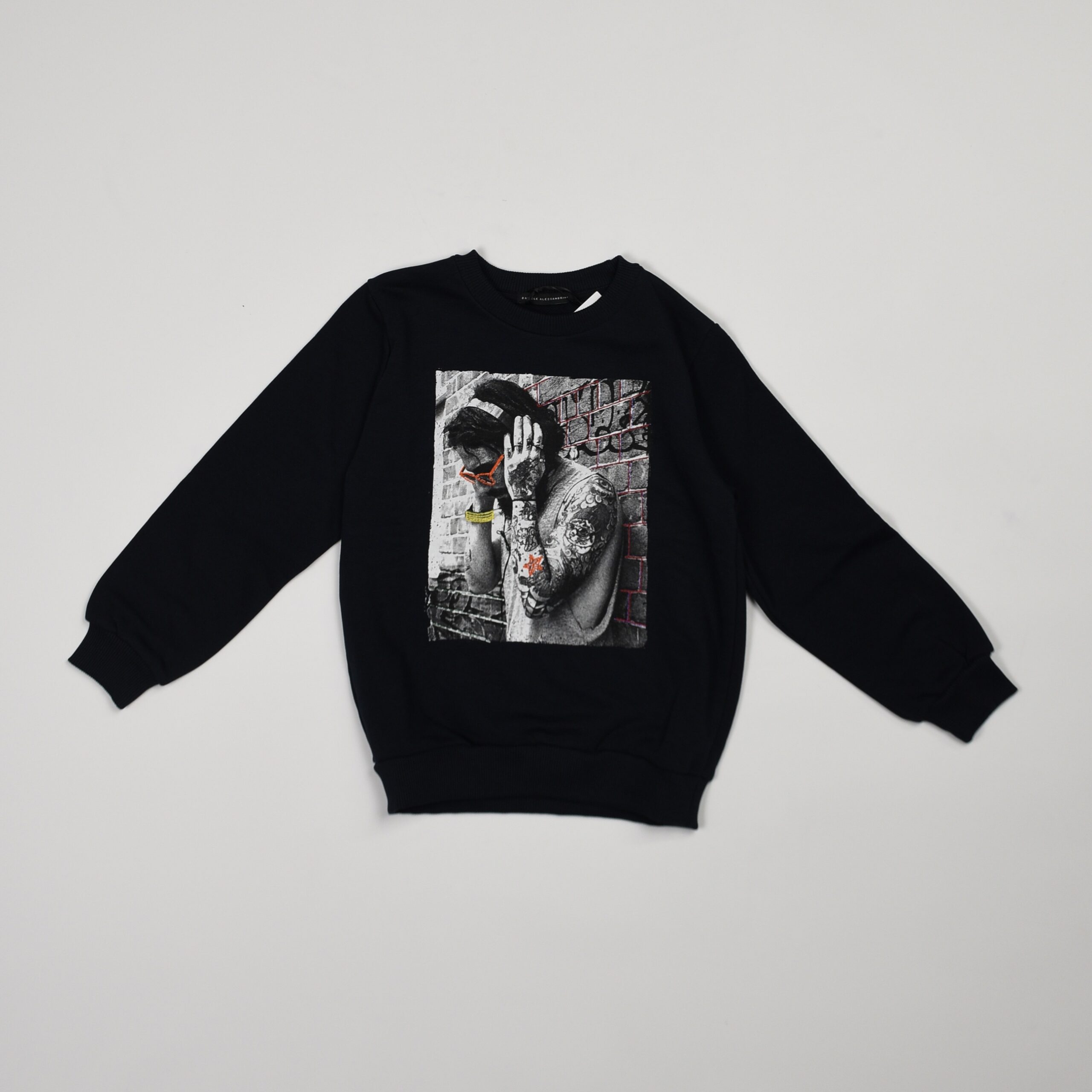 Felpa nera a maniche lunghe con stampa frontale in stile fotografico raffigurante ragazzo con cuffie, occhiali e dettagli colorati a contrasto. Modello girocollo con polsini e fondo a costine. Vestibilità regolare.