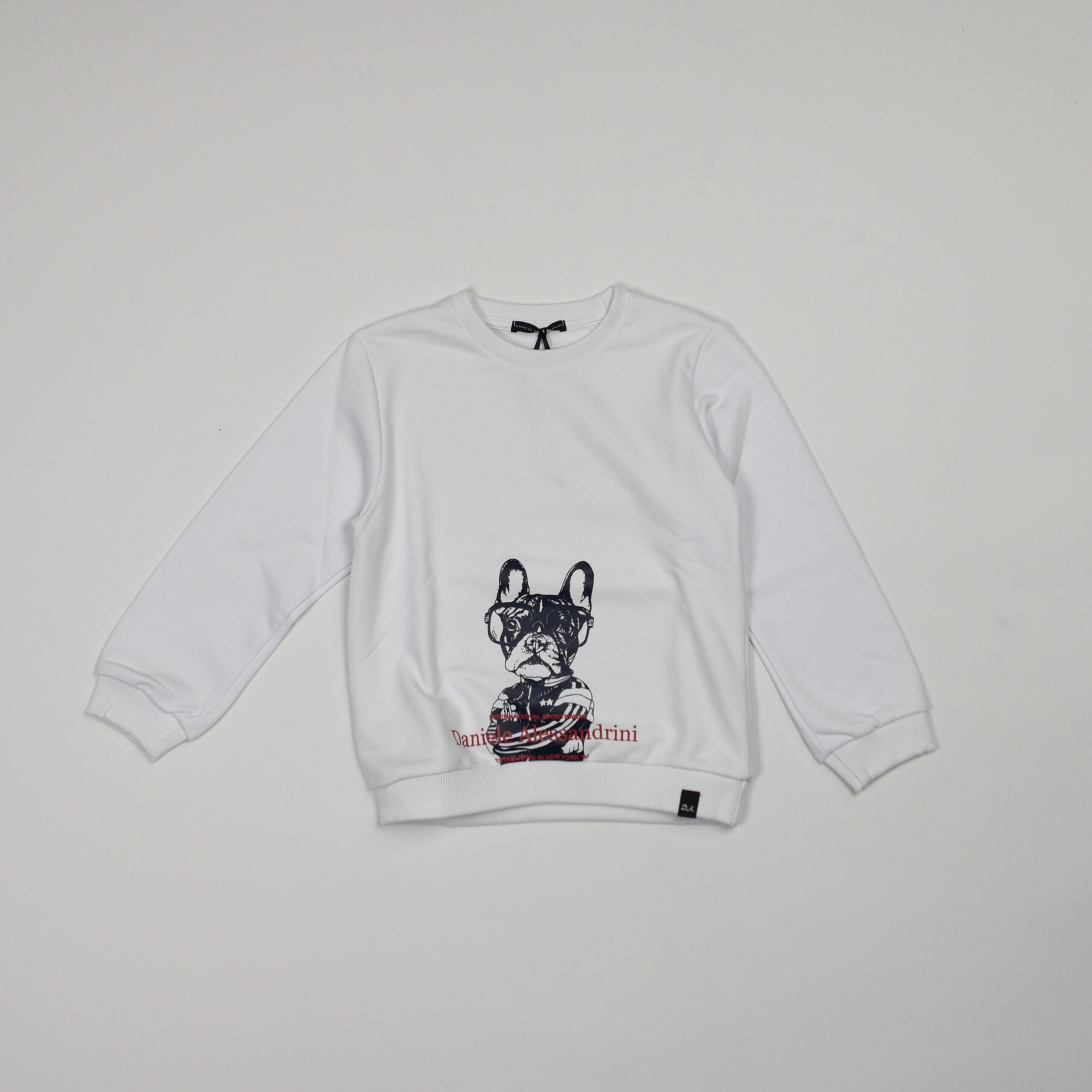 Felpa in cotone, colore bianco. Modello girocollo a maniche lunghe con polsini e fondo elasticizzati. Stampa frontale con bulldog in stile grafico e logo Daniele Alessandrini a contrasto.
