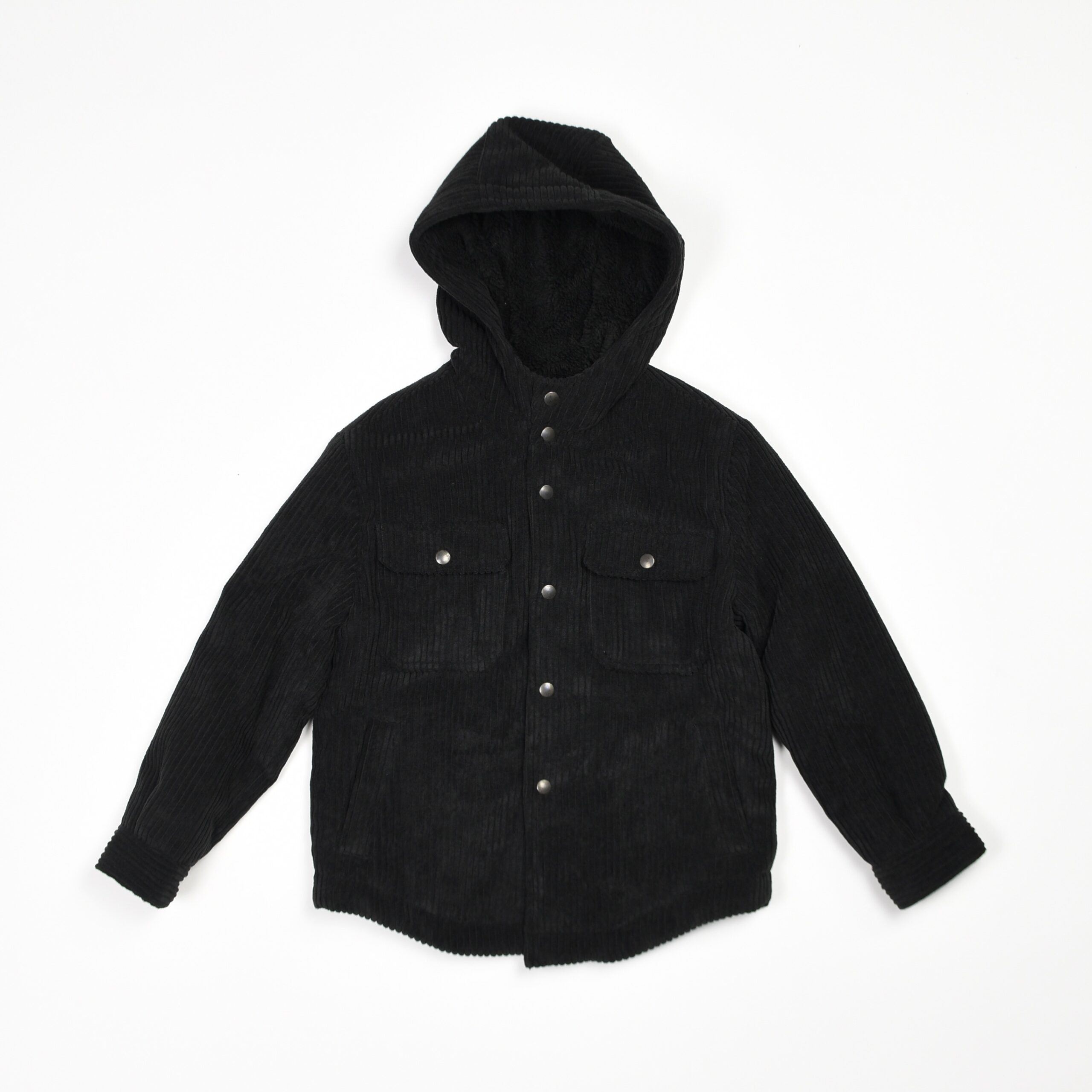 Giacca in velluto a coste dal design elegante e casual, con cappuccio fisso e chiusura frontale a bottoni automatici. Presenta due tasche applicate sul petto con pattina e bottoni e tasche laterali a filo. Morbida e calda, è un capo versatile ideale per la stagione fredda.
