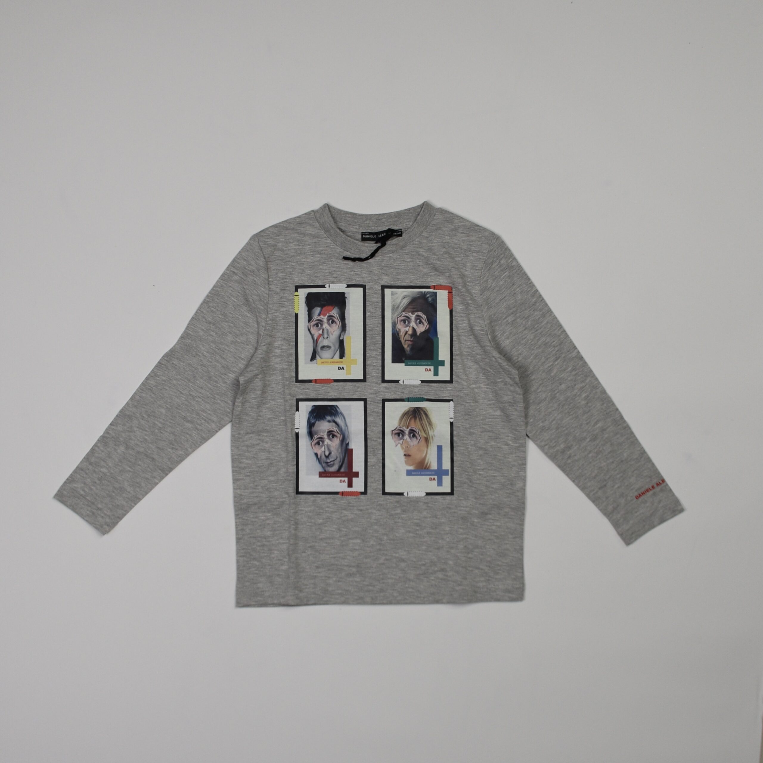 Maglia girocollo in cotone grigio melange, caratterizzata da stampa frontale con quattro ritratti stilizzati a colori, incorniciati da dettagli grafici a contrasto. Logo Daniele Alessandrini ricamato sul polsino. Un capo dallo stile contemporaneo e creativo, perfetto per un look originale.
