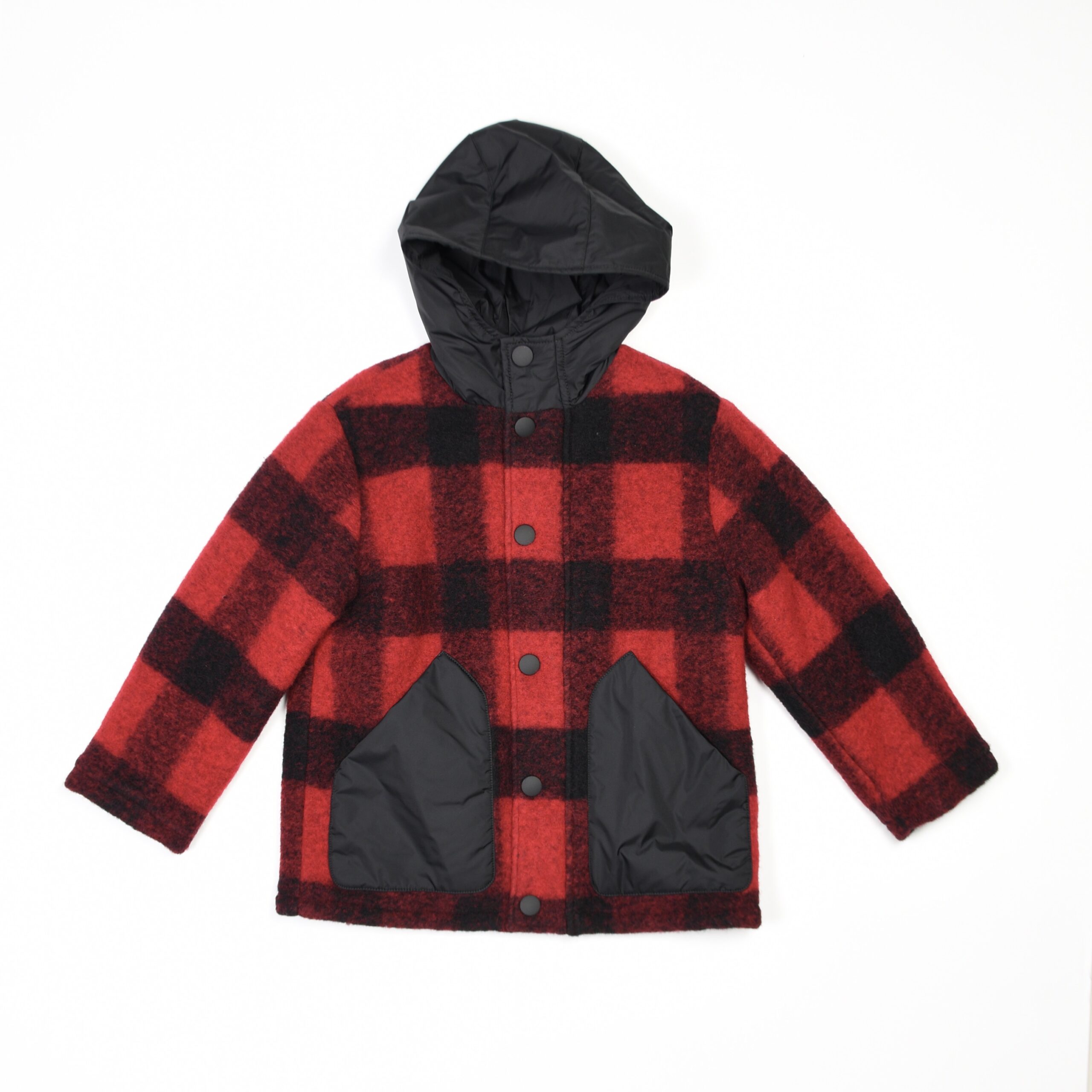 Cappotto Aspesi in morbido tessuto misto lana con fantasia a quadri rossi e neri. Presenta cappuccio in nylon nero, chiusura frontale con bottoni a pressione e tasche applicate a contrasto. Un modello caldo, confortevole e dallo stile deciso, perfetto per look casual ma ricercati.
