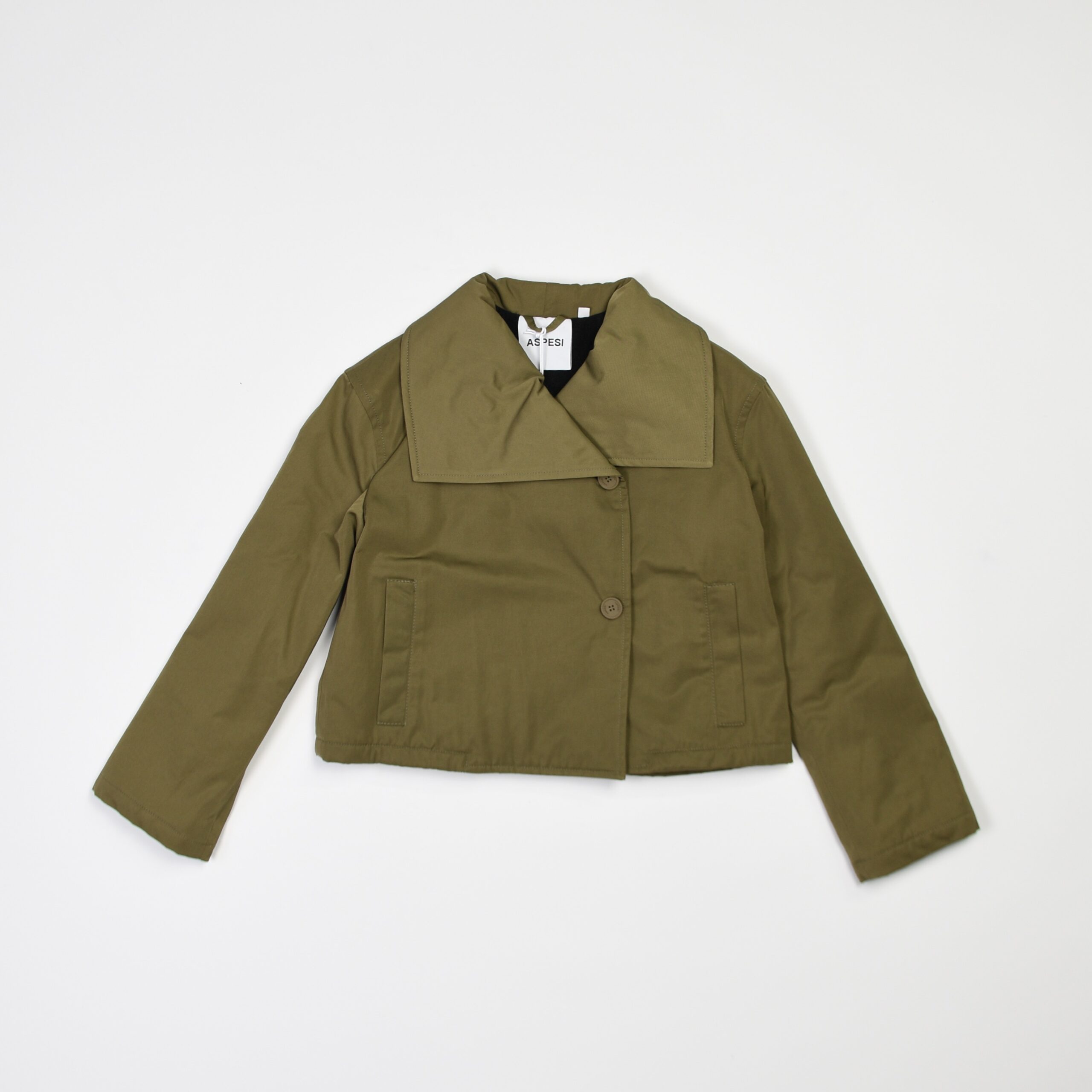 Giacca corta verde militare con chiusura a bottoni e ampio collo a revers. Realizzata in tessuto leggero, dal taglio moderno e minimal, è un capo versatile che unisce praticità e stile, ideale per look casual chic nelle mezze stagioni.