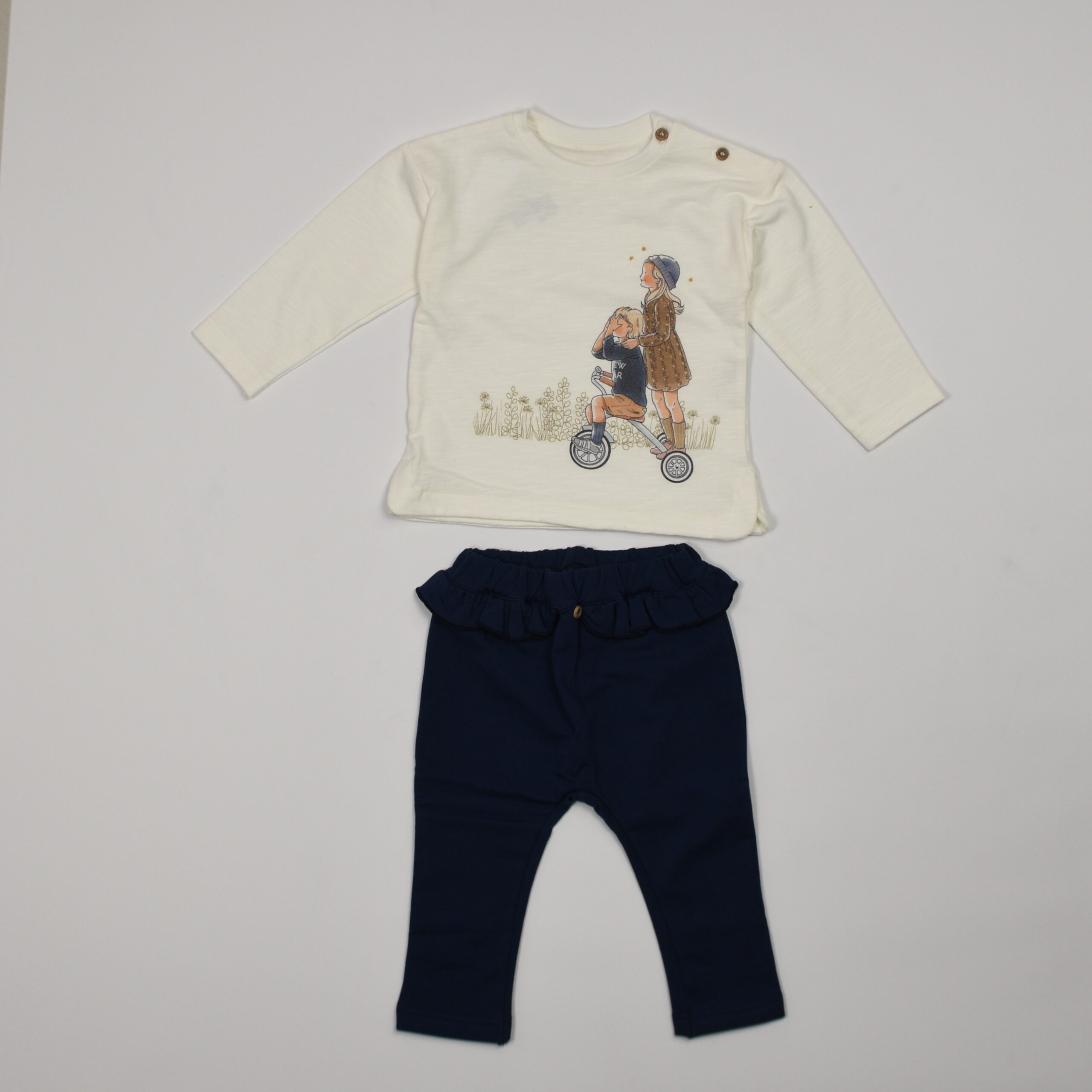 Completo due pezzi composto da t-shirt a manica lunga color panna con dolce stampa frontale e apertura con bottoncini sulla spalla, abbinata a leggings blu navy con vita arricciata e dettaglio decorativo. Realizzato in morbido cotone, pensato per garantire comfort e praticità ai più piccoli.