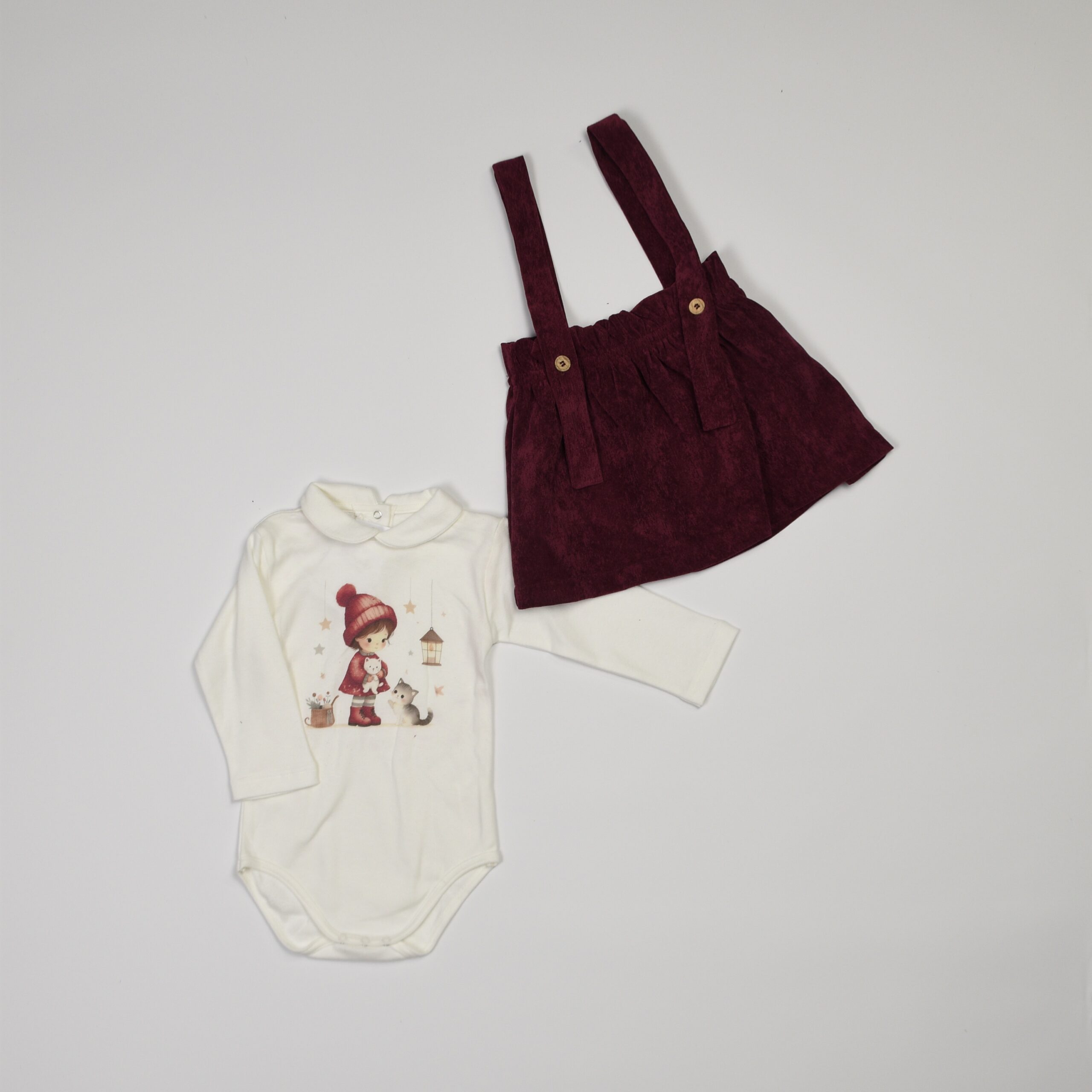 Completo due pezzi composto da body a maniche lunghe in jersey color avorio con stampa dolce a tema invernale sul davanti e colletto tondo, abbinato a gonnellina con bretelle in tessuto effetto velluto color bordeaux intenso, con bottoni in legno. Firmato Babyvip.