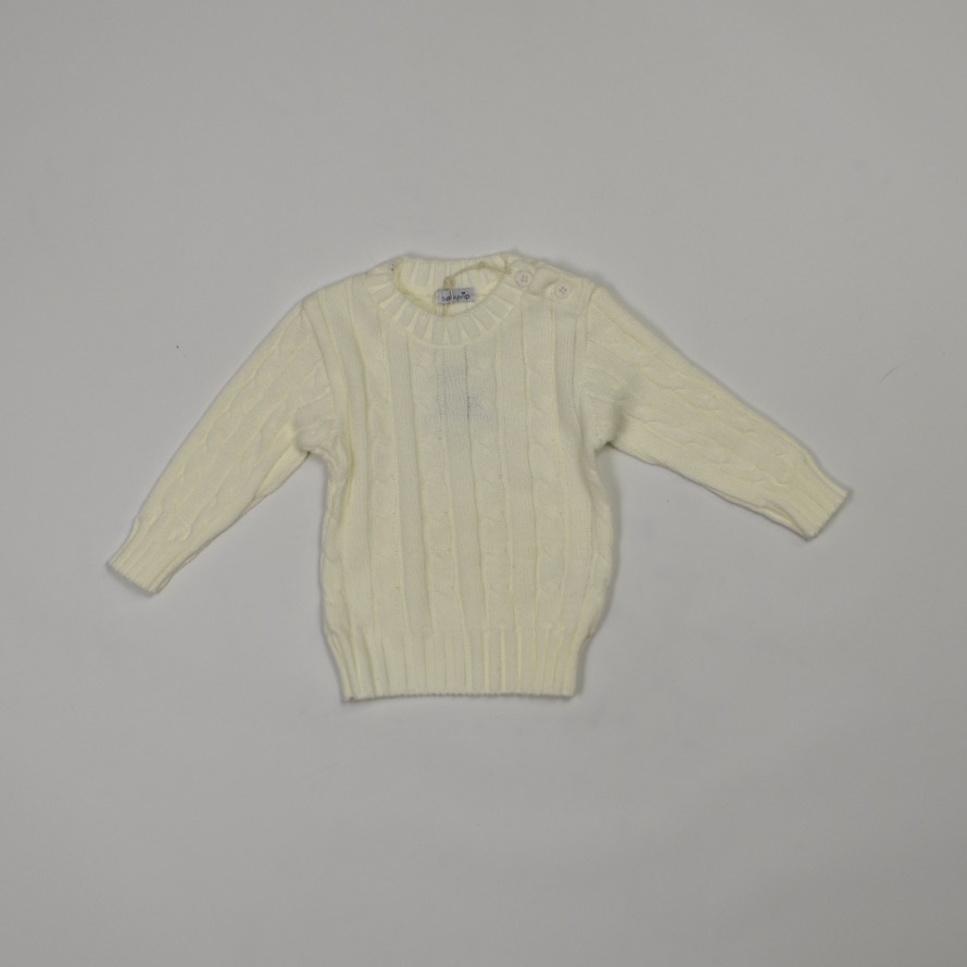 Maglia Baby Vip in morbido tricot color panna, con motivo a trecce sul davanti e bottoncini sulla spalla per una facile vestibilità.