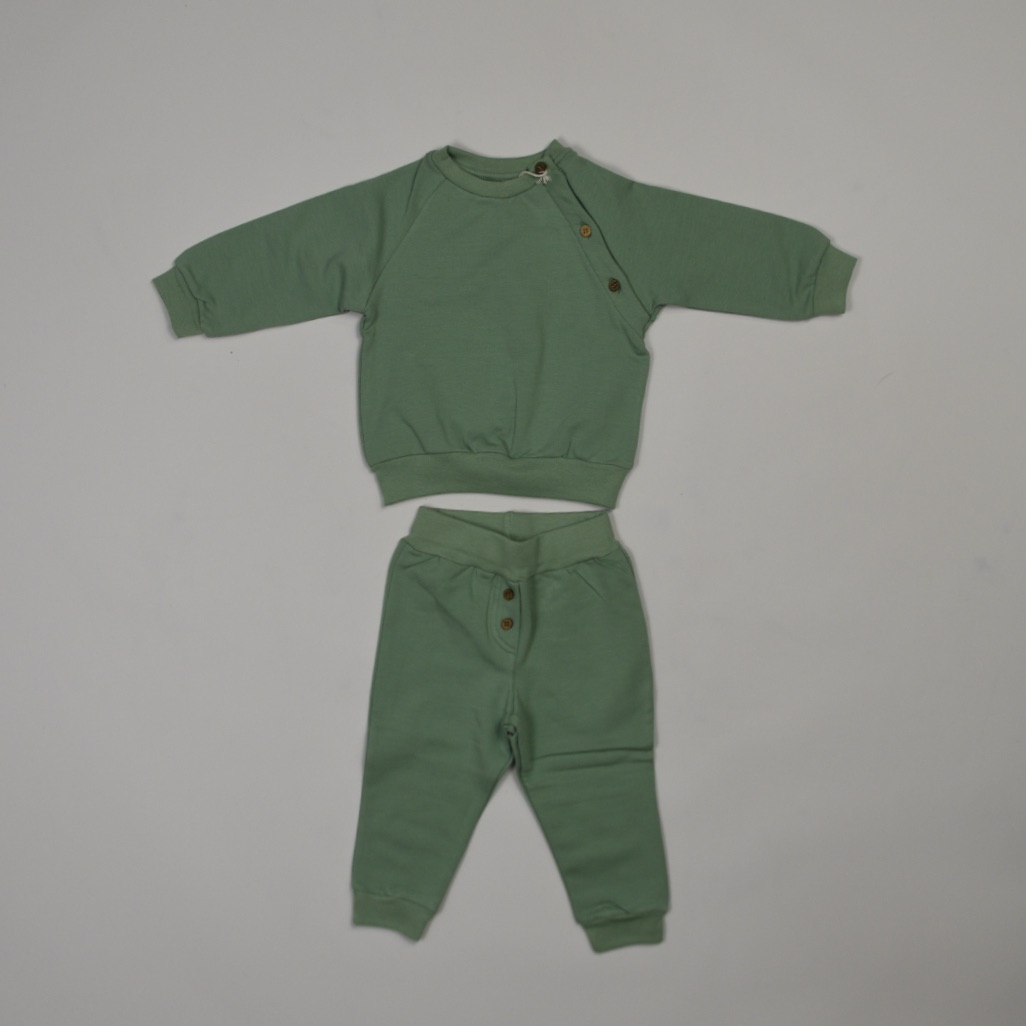 Completo Baby Vip in morbido cotone felpato color verde salvia, composto da felpa girocollo con bottoncini laterali e pantaloni coordinati con dettaglio di bottoni decorativi sul davanti.