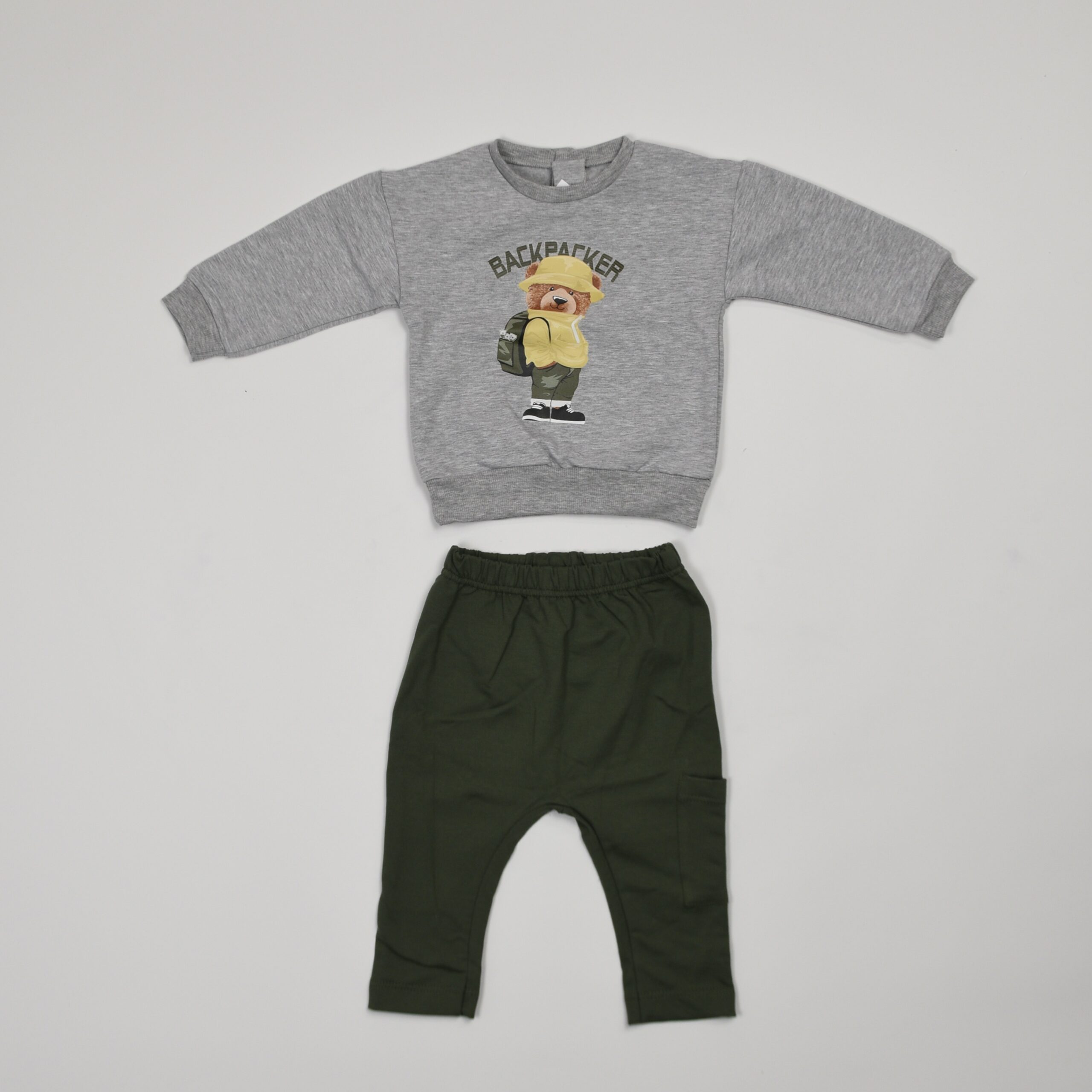 La felpa grigio chiaro presenta la simpatica stampa di un orsetto con zaino e la scritta “Backpacker”, per un tocco allegro e avventuroso.