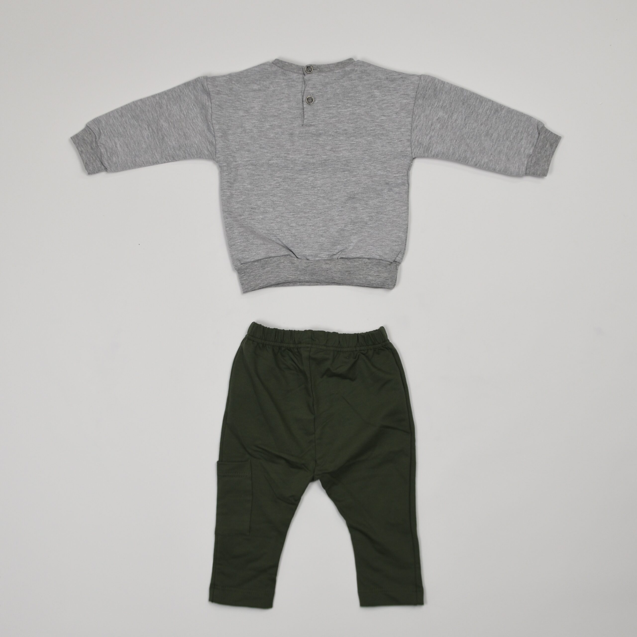 I pantaloni, in verde militare, hanno vita elasticizzata e vestibilità confortevole, perfetti per accompagnare il bimbo nei movimenti di ogni giorno.