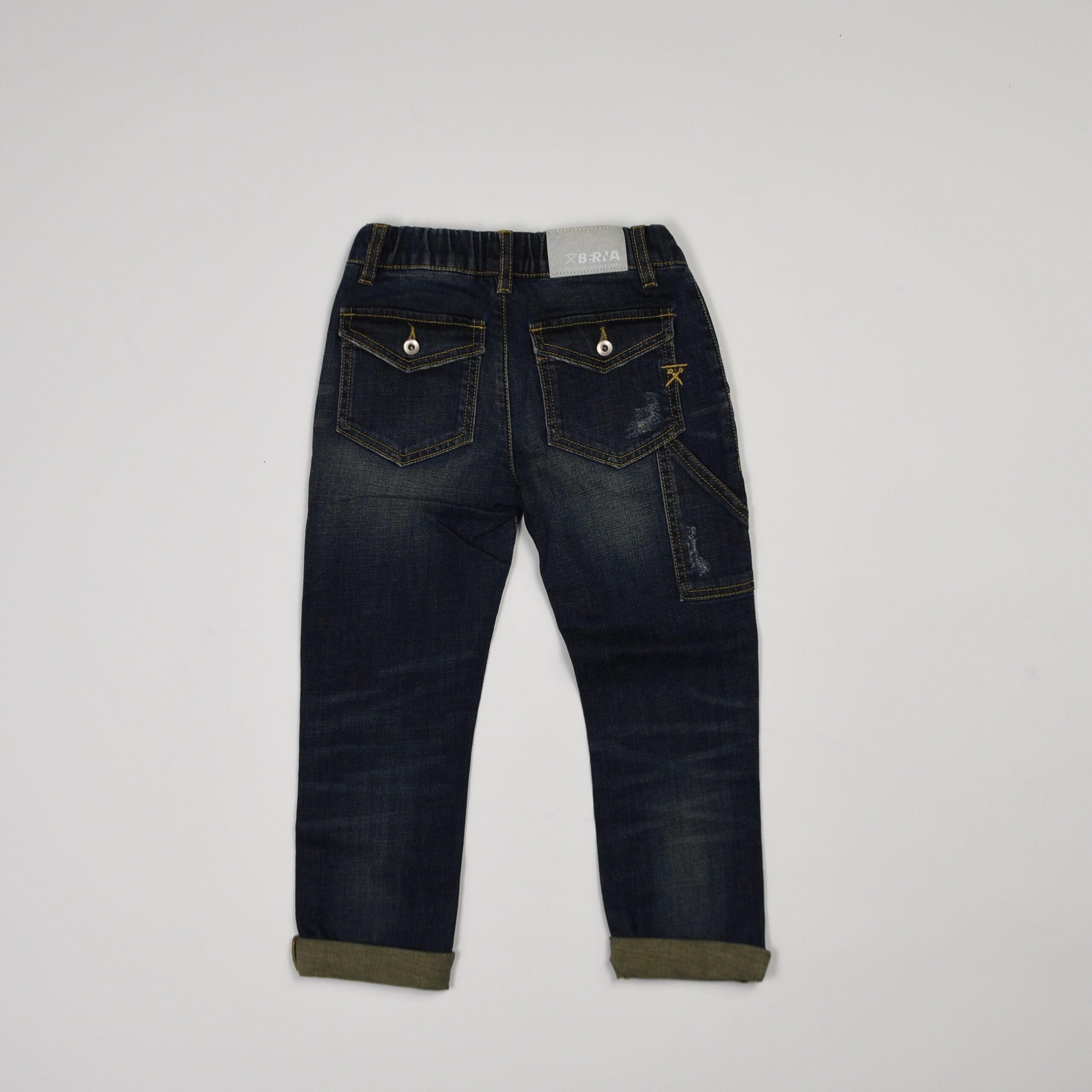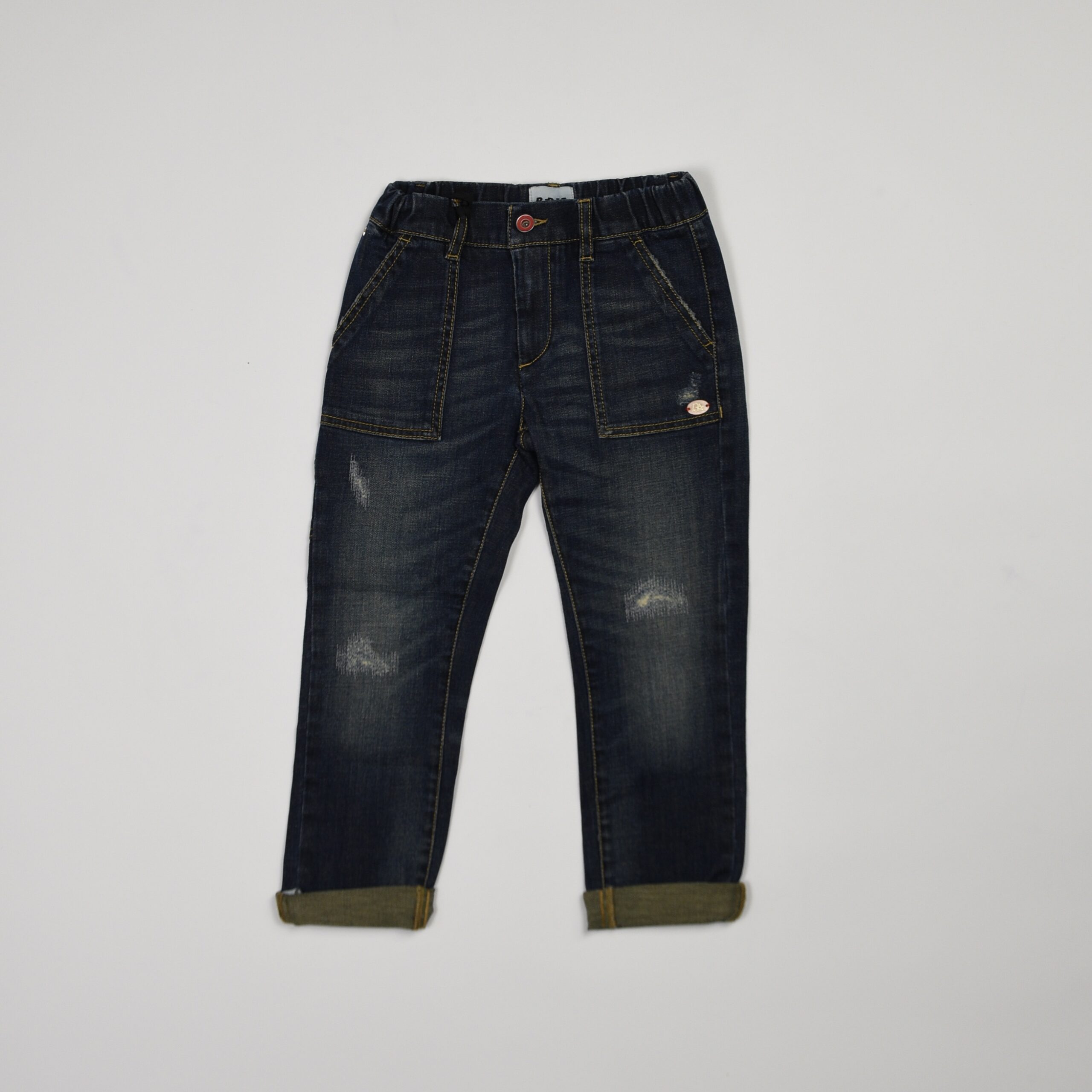 Jeans in denim blu scuro con lavaggio sfumato ed effetto leggermente vissuto. Modello con tasche applicate sul davanti, piccola taschina con logo e dettagli con leggere abrasioni. Vita con elastico regolabile e bottone, fondo gamba con risvolto. Vestibilità comoda.