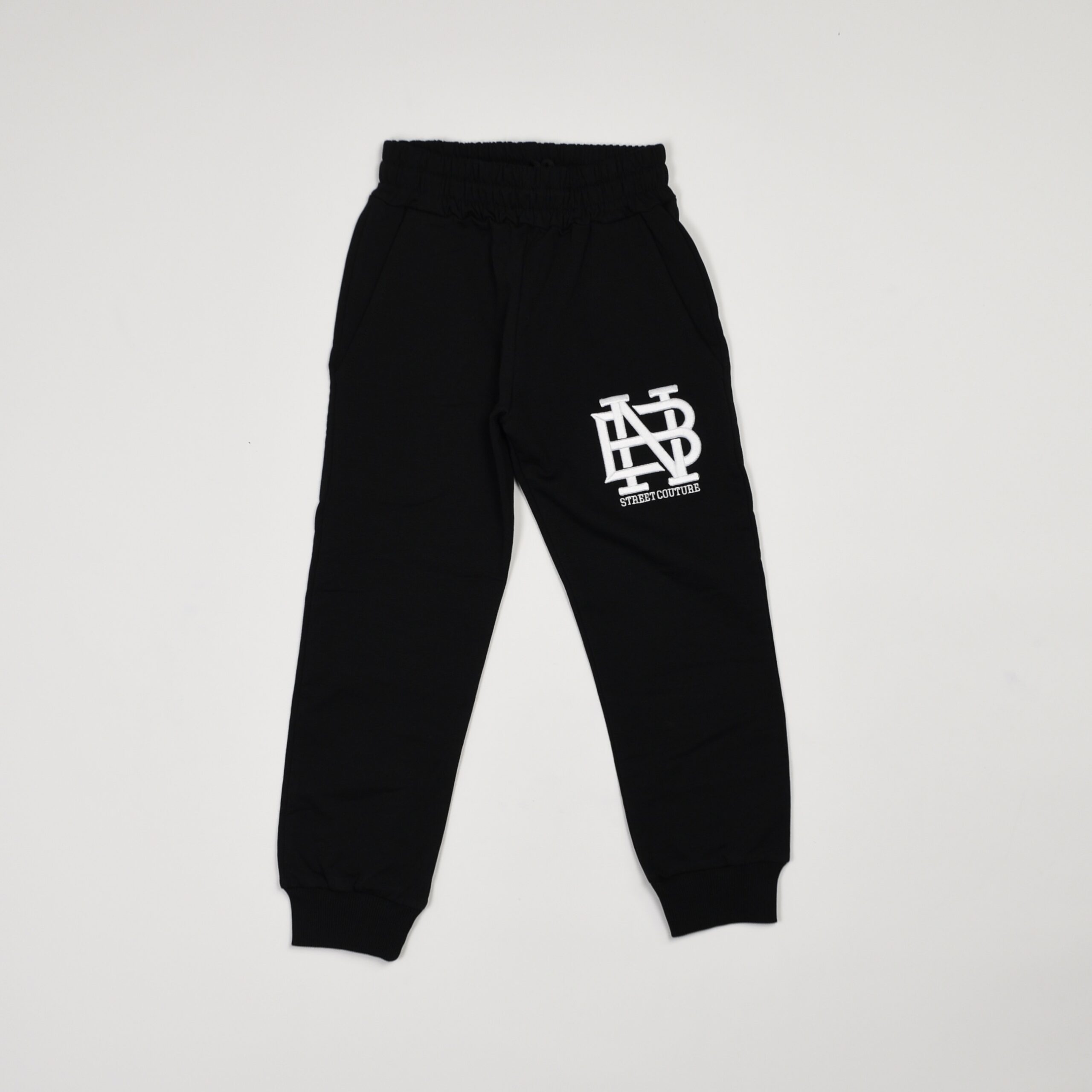 Pantalone jogger in cotone, colore nero. Modello con elastico in vita e coulisse interna, tasche laterali e fondo gamba con polsino elasticizzato. Logo But Not Street Couture stampato a contrasto in bianco sulla gamba.