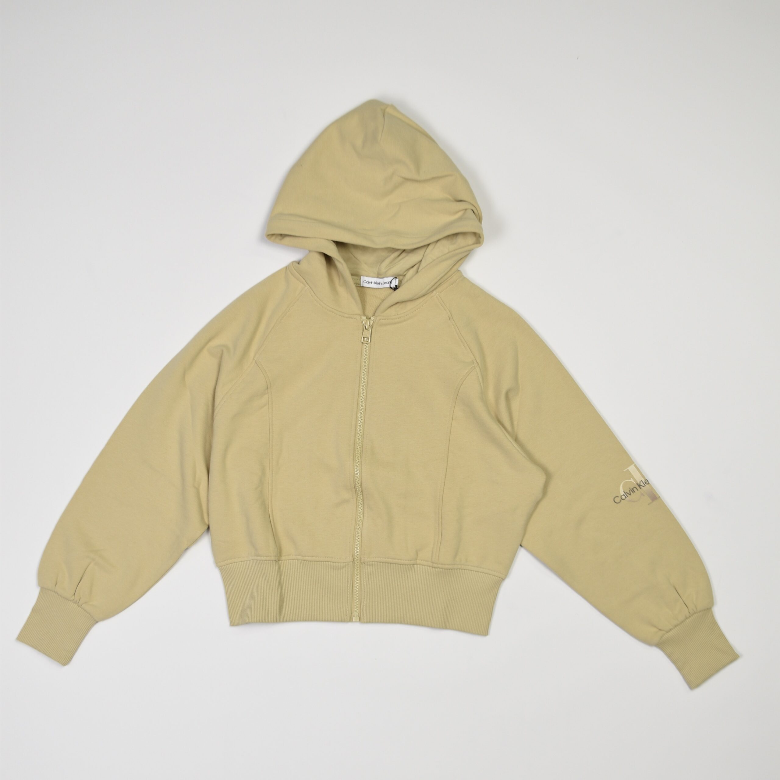 Felpa in cotone color beige sabbia, con zip intera e cappuccio. Linea morbida con fondo e polsini a costine per una vestibilità confortevole. Logo Calvin Klein Jeans stampato sulla manica sinistra, dettaglio discreto ma di carattere. Un capo versatile, perfetto per il tempo libero e gli outfit casual.