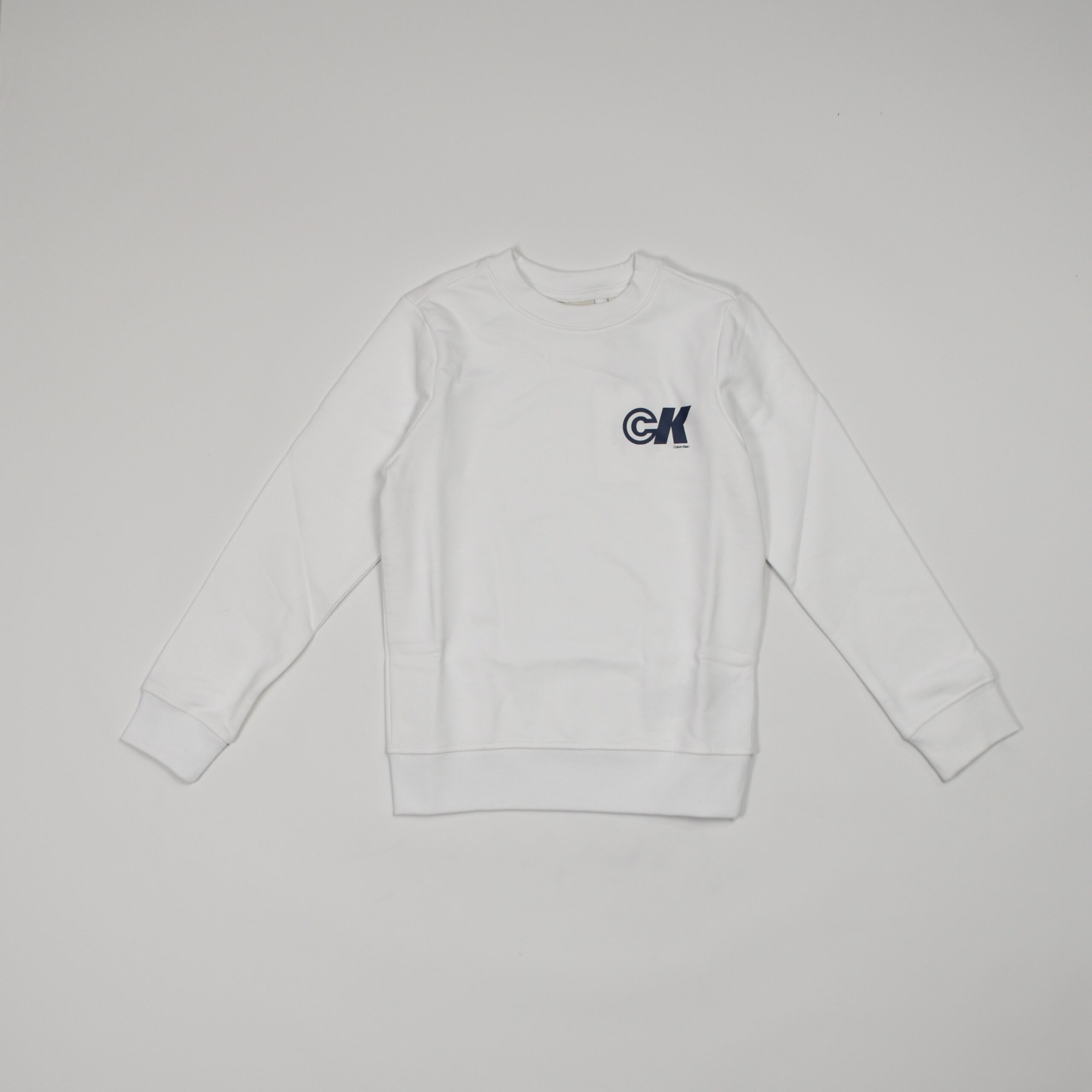 Il modello presenta girocollo, maniche lunghe e il logo CK ricamato in blu navy sul petto, per un tocco sobrio ma distintivo.