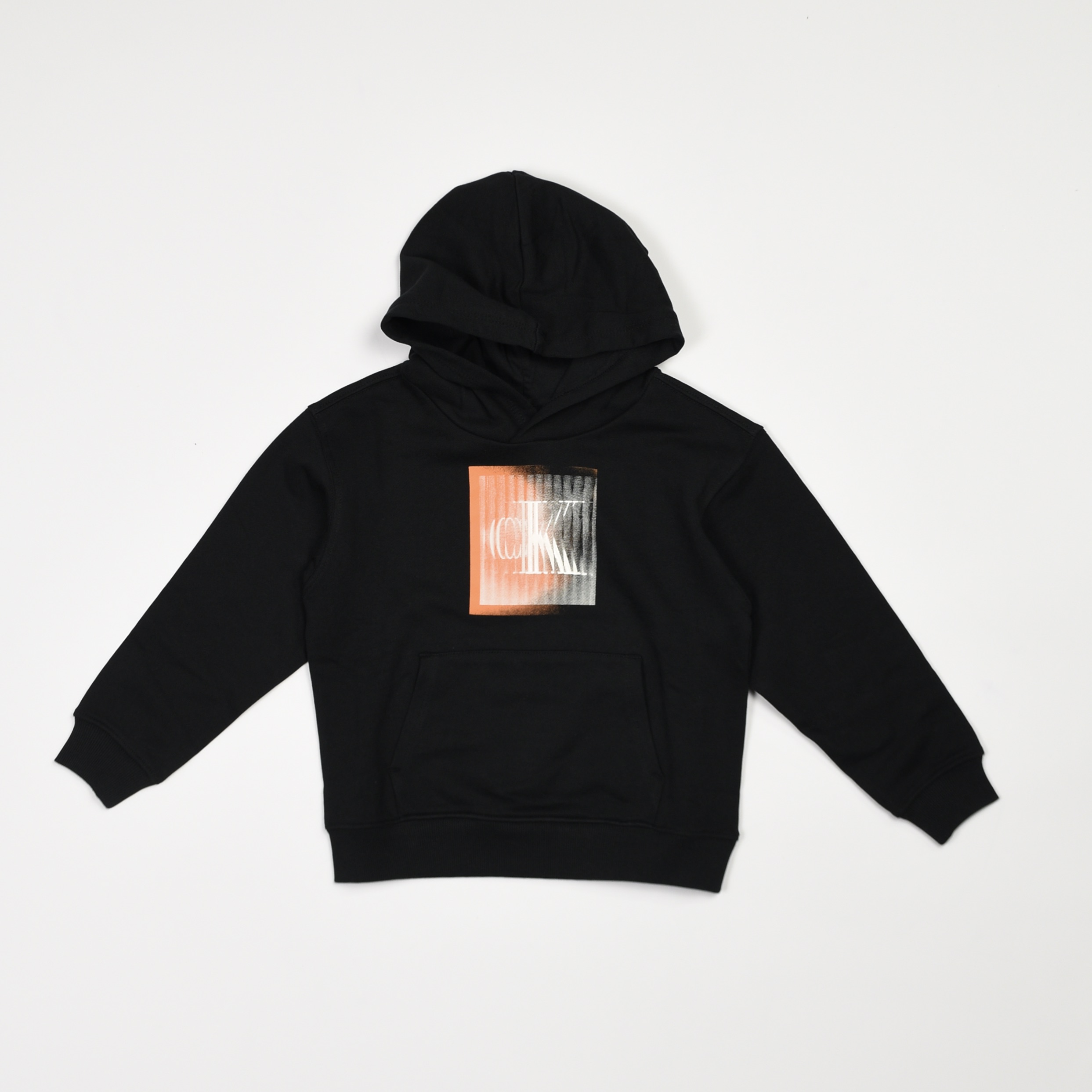 Felpa in cotone, colore nero. Modello con cappuccio e tasca a marsupio, maniche lunghe con polsini elasticizzati. Sul davanti stampa rettangolare sfumata arancione/bianco/nero con logo CK centrale.