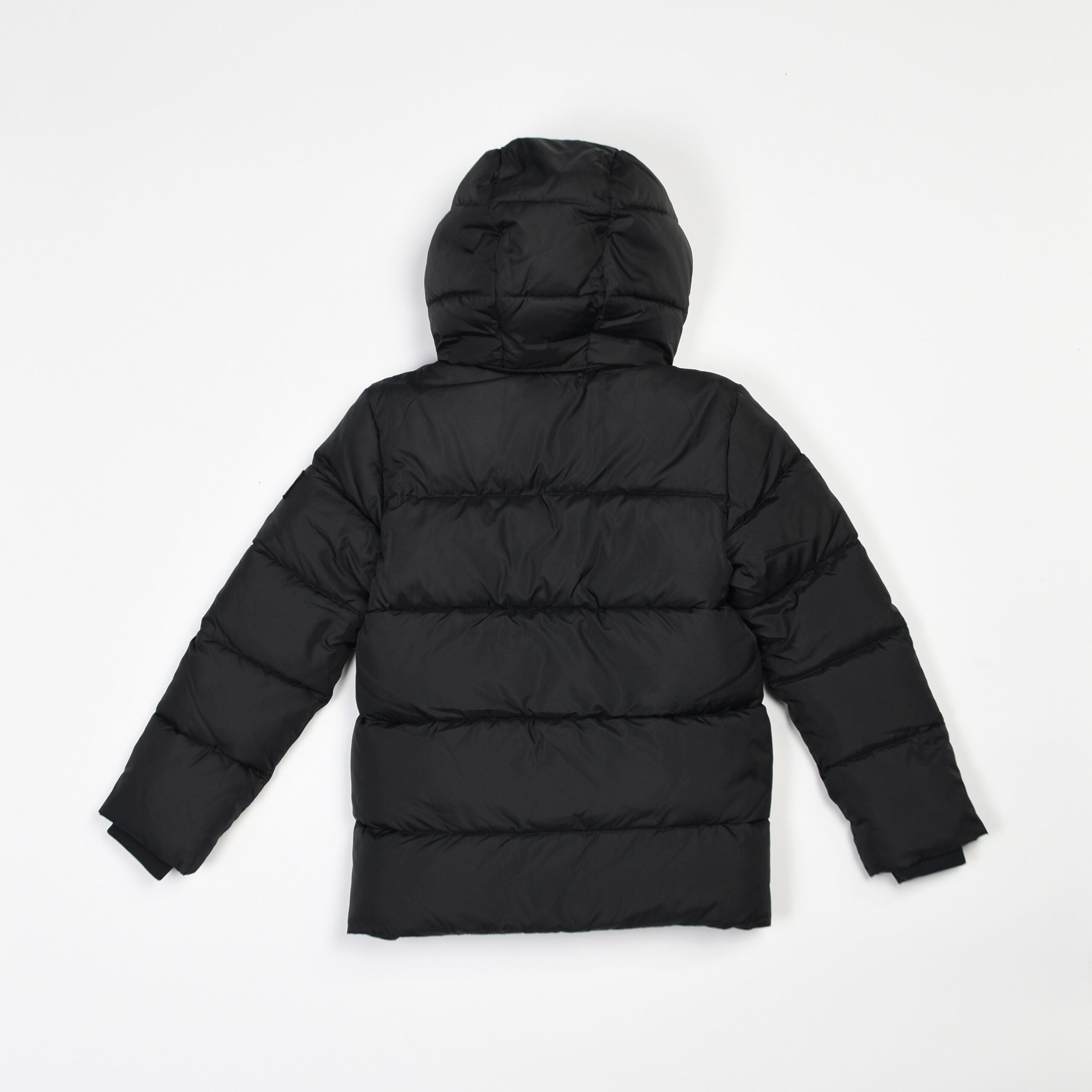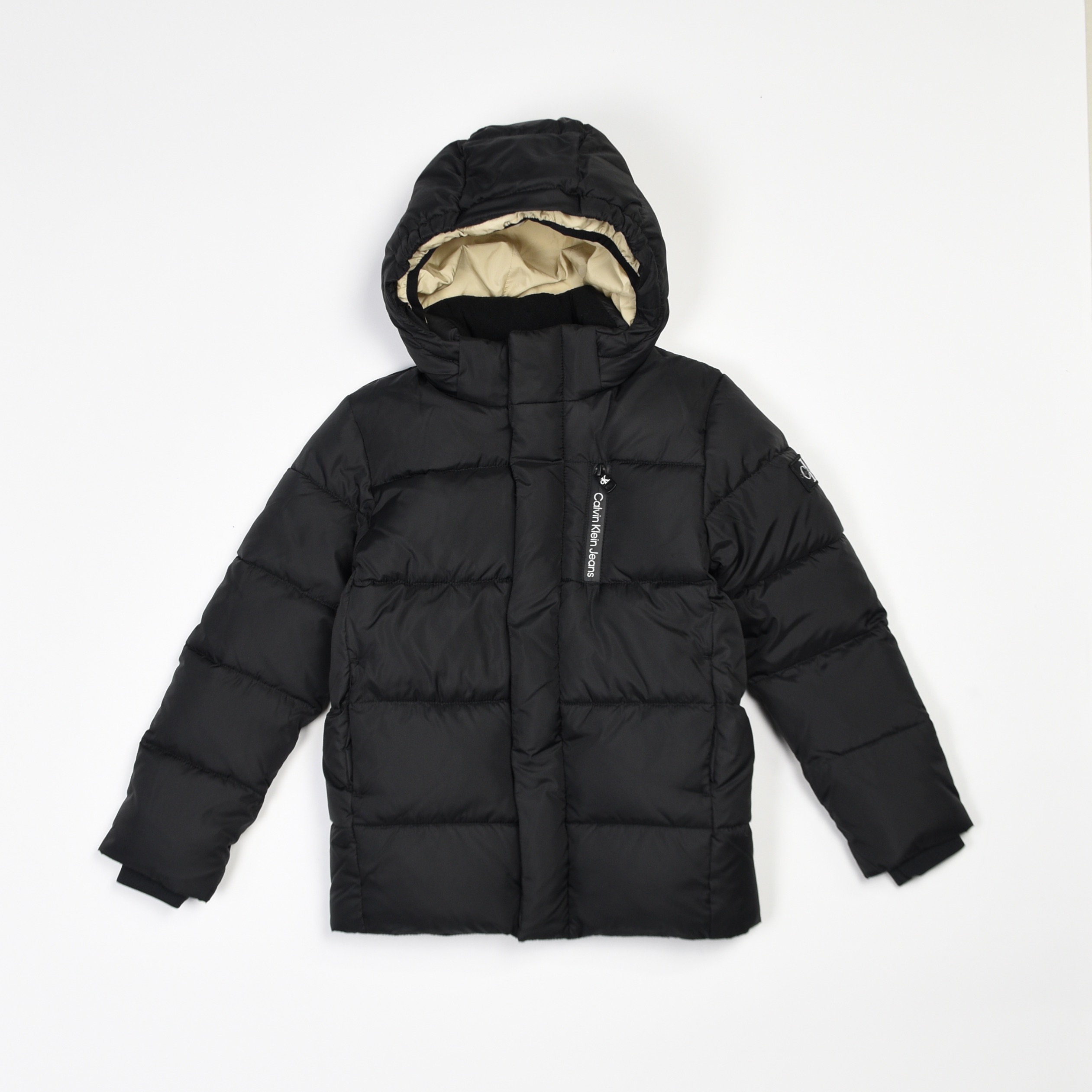 Piumino Calvin Klein Jeans in colore nero opaco con interno a contrasto beige. Modello trapuntato con cappuccio fisso, chiusura a zip coperta da patta e tasca frontale verticale con logo Calvin Klein applicato. Polsini con inserto elasticizzato per una maggiore protezione dal freddo.