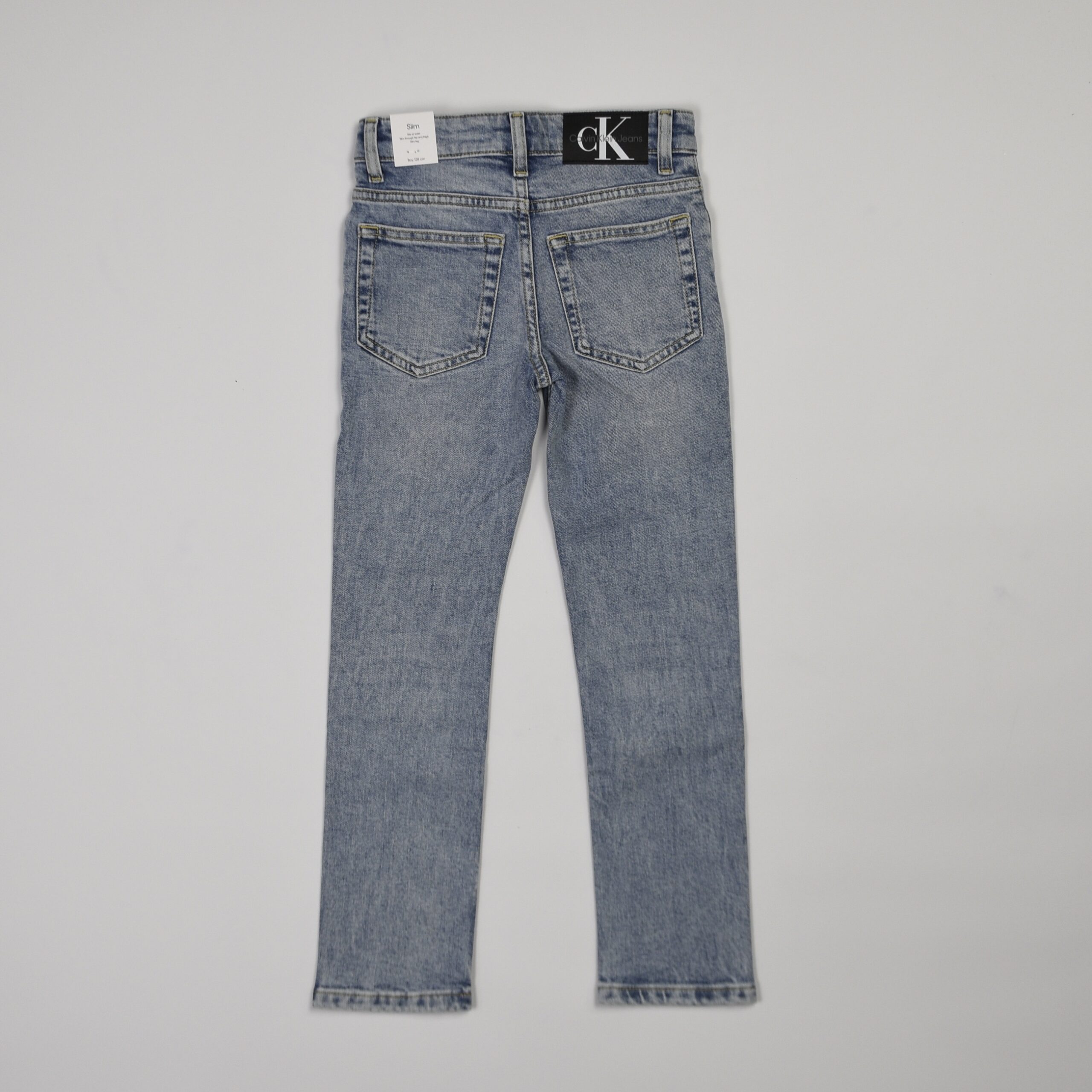 Jeans in denim stretch lavaggio chiaro. Modello cinque tasche con chiusura a bottone e zip, passanti in vita e linea slim. Dettaglio etichetta con logo Calvin Klein Jeans applicata sul retro.
