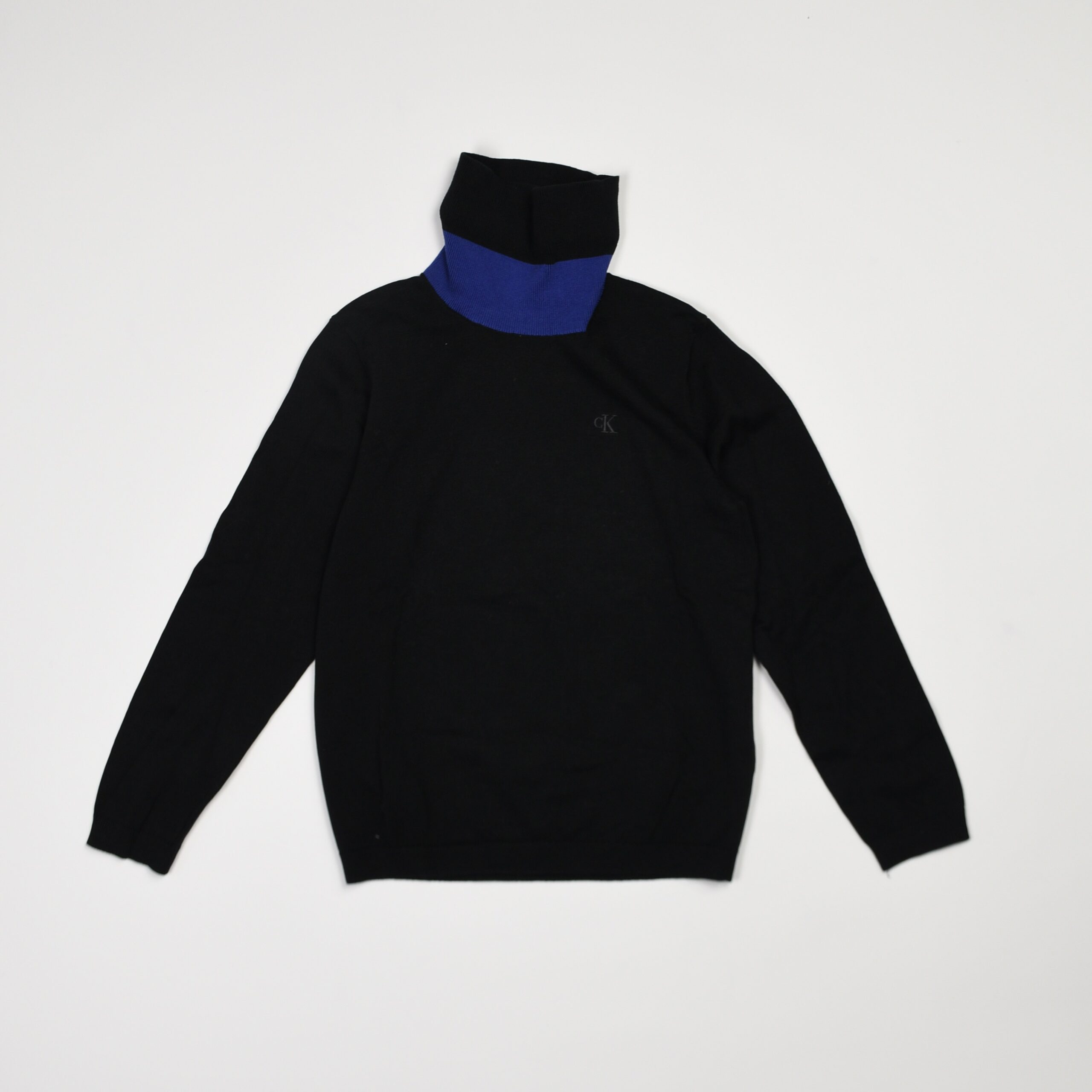 Maglia a maniche lunghe in misto lana firmata Calvin Klein, colore nero intenso con collo alto a contrasto in blu cobalto.