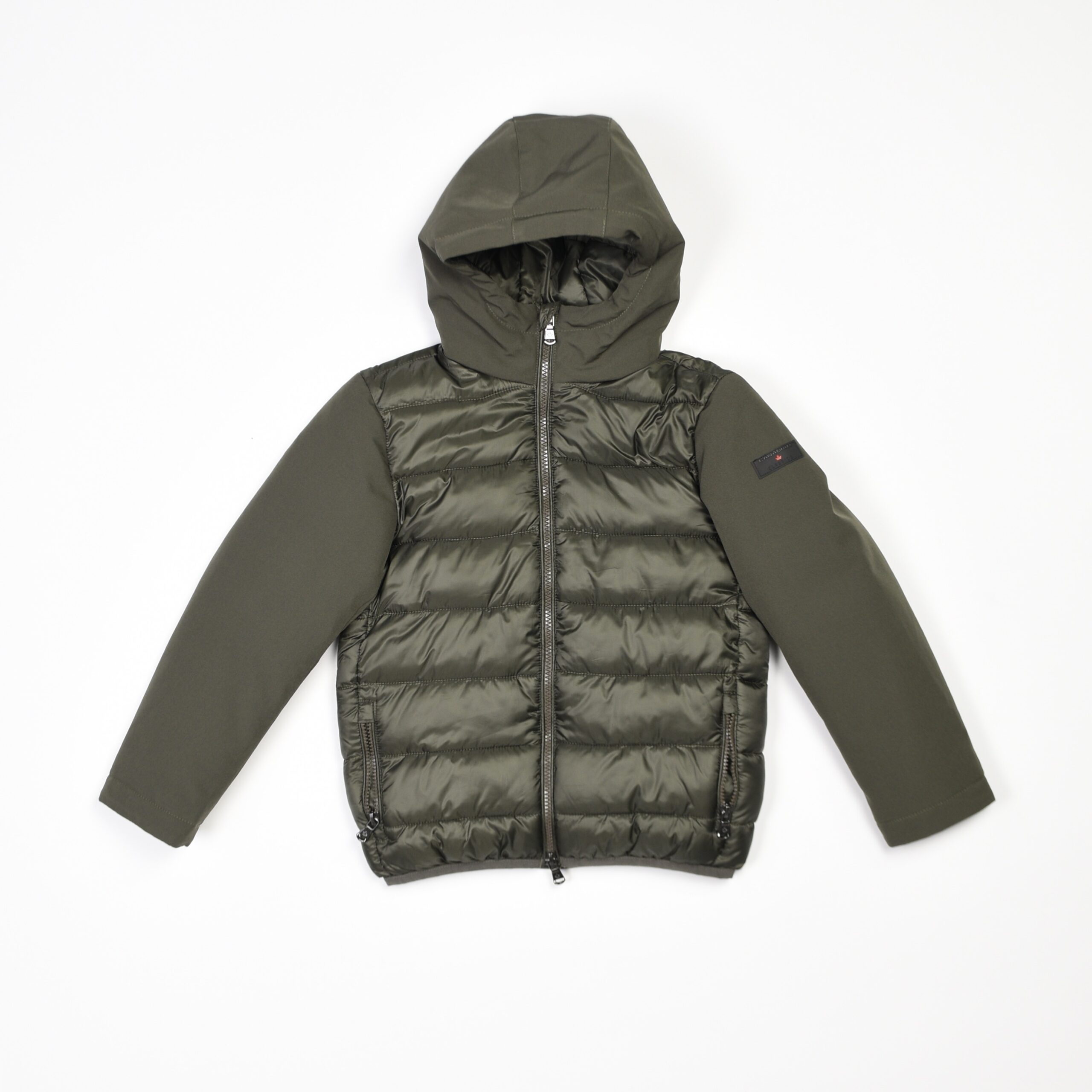 Giubbotto Canadian Classics color verde militare con corpo trapuntato effetto piumino e maniche in tessuto softshell. Modello con cappuccio fisso, chiusura frontale con zip a doppio cursore e tasche laterali con zip. Design contemporaneo, pratico e confortevole, ideale per look casual e urbani.