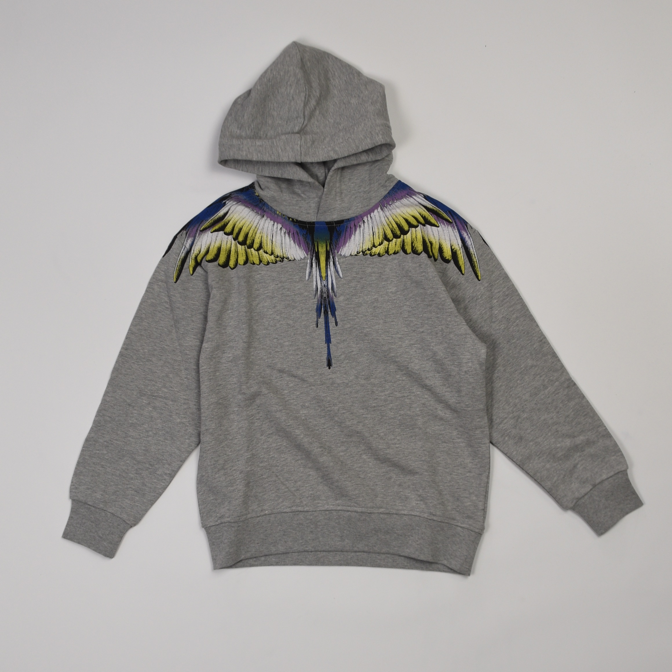 Felpa con cappuccio grigia County of Milan in cotone, caratterizzata da stampa grafica multicolore ad effetto ali sulle spalle e lungo il petto. Modello con cappuccio fisso, polsini e fondo a costine.