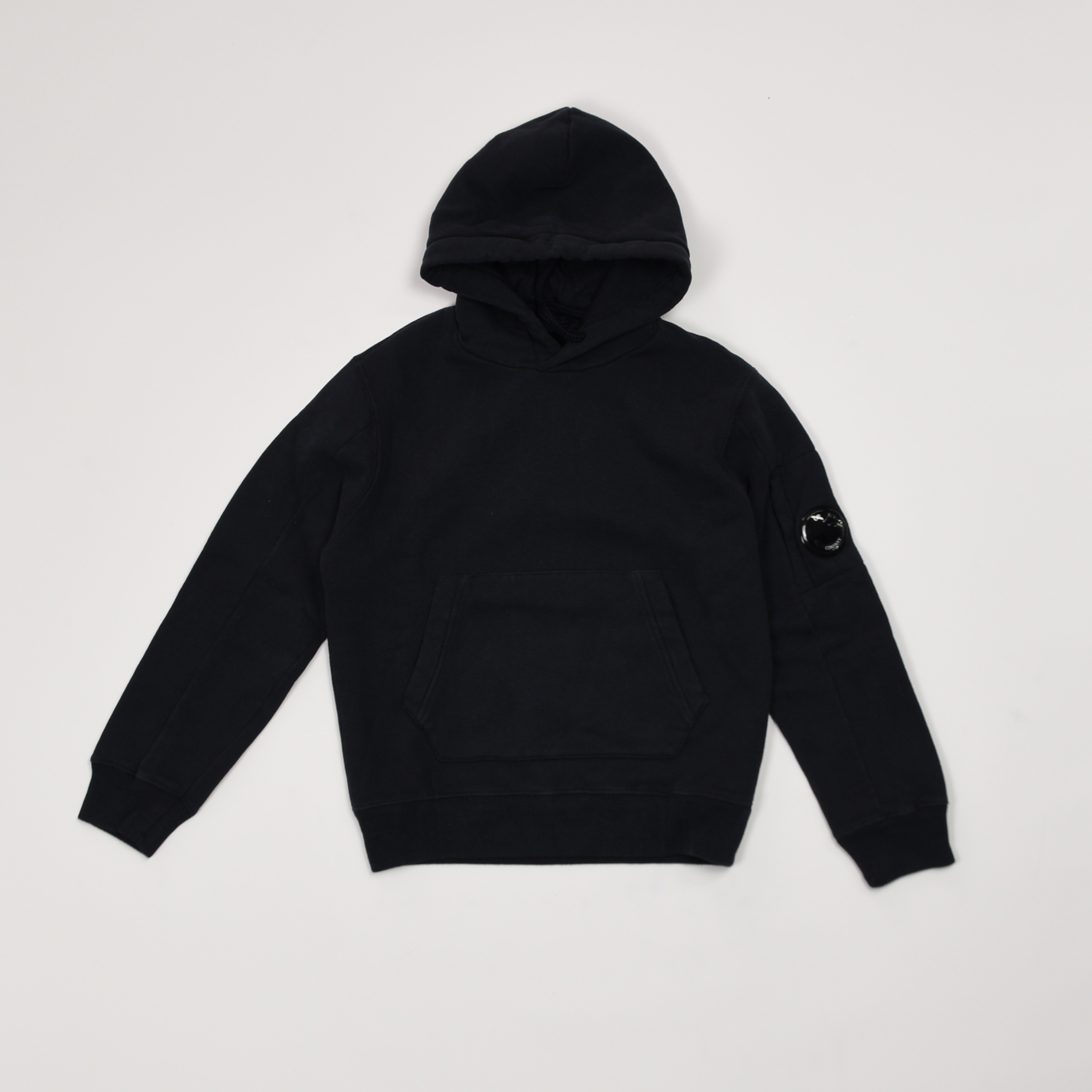 Felpa in cotone colore nero, modello con cappuccio e tasca a marsupio. Maniche lunghe con fondo e polsini a costine. Caratterizzata dall’iconica lente C.P. Company applicata sulla manica sinistra. Vestibilità regolare, ideale per un look casual e sportivo.