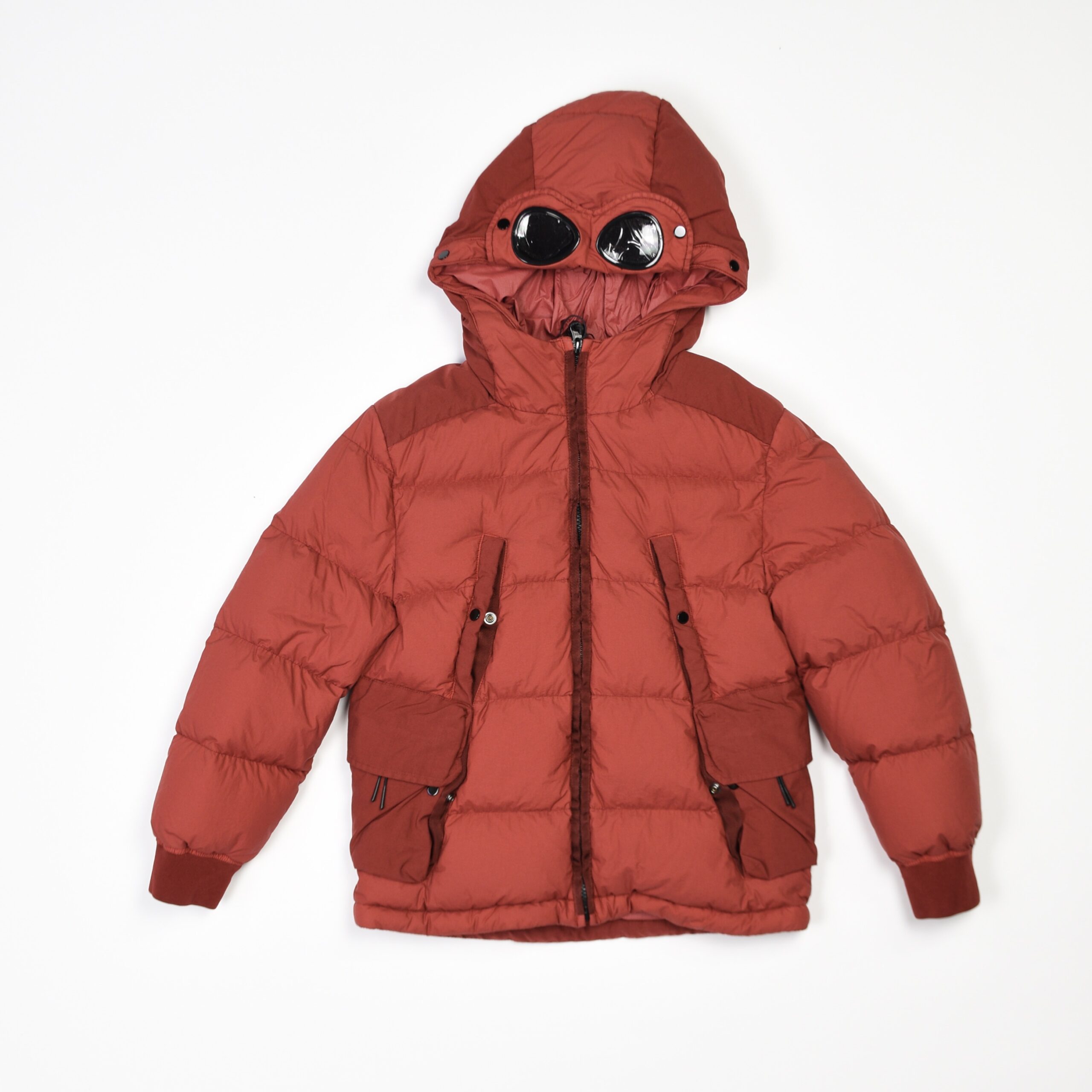 Piumino imbottito C.P. Company color rosso mattone, con cappuccio integrato dotato di iconiche lenti nere. Modello trapuntato, chiusura frontale con zip e tasche laterali con patta e bottoni. Polsini in maglia e dettagli tono su tono completano il design. Un capo caldo e dal carattere deciso, perfetto per distinguersi nelle giornate invernali.