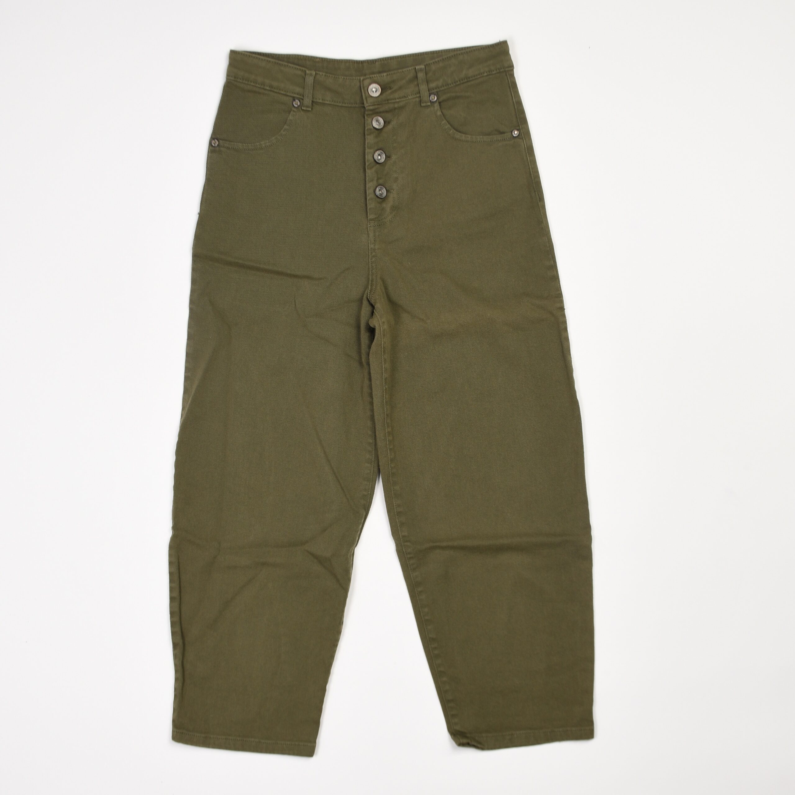 Pantalone a vita alta in cotone verde militare, caratterizzato da chiusura frontale con bottoni a vista. Modello a gamba dritta con tasche laterali e posteriori applicate, dal design pratico e contemporaneo.