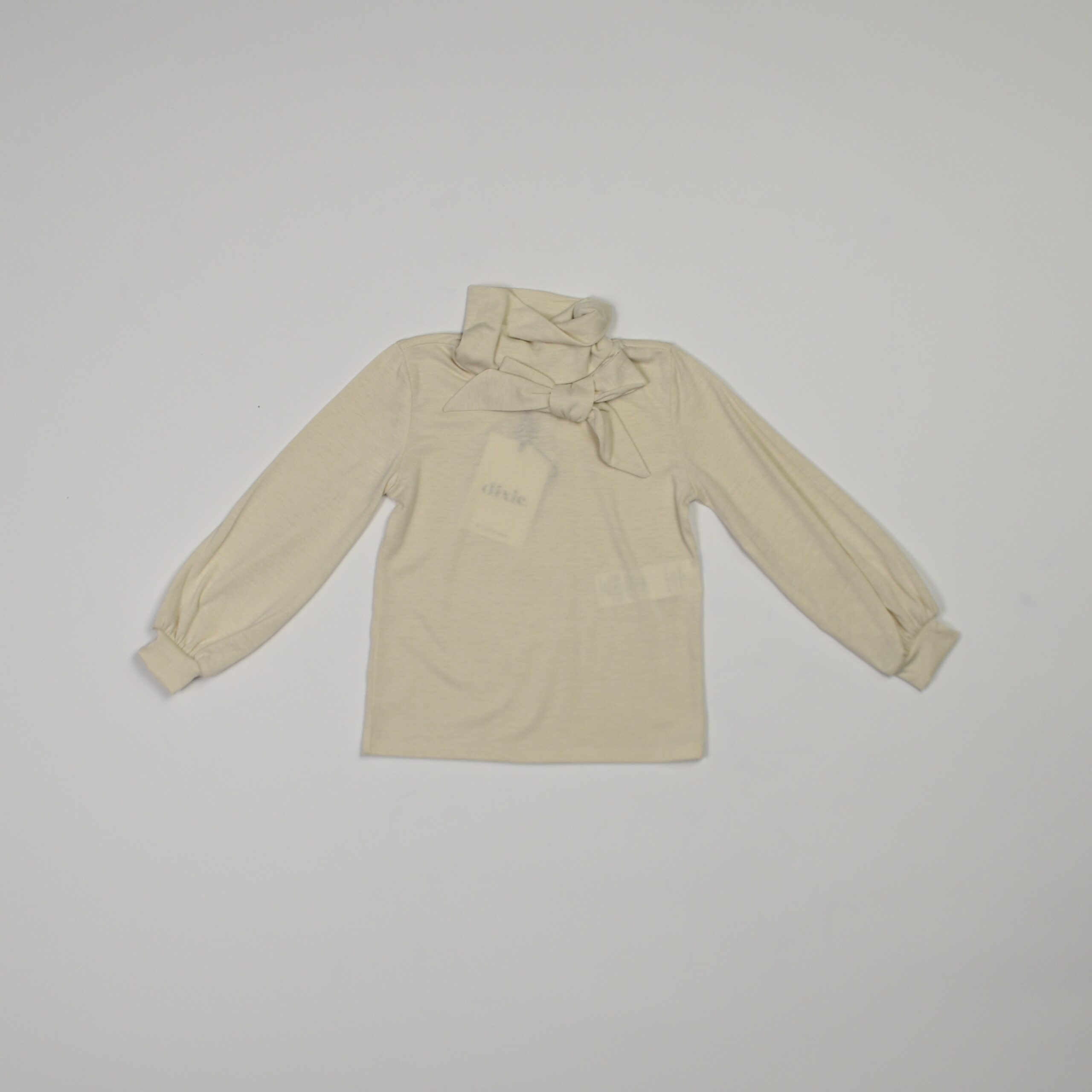 Maglia a maniche lunghe firmata Dixie, realizzata in morbido tessuto color beige. Presenta un elegante collo alto arricchito da un maxi fiocco laterale e polsini elasticizzati che donano volume alle maniche. Un capo raffinato e femminile, perfetto per look ricercati e alla moda.