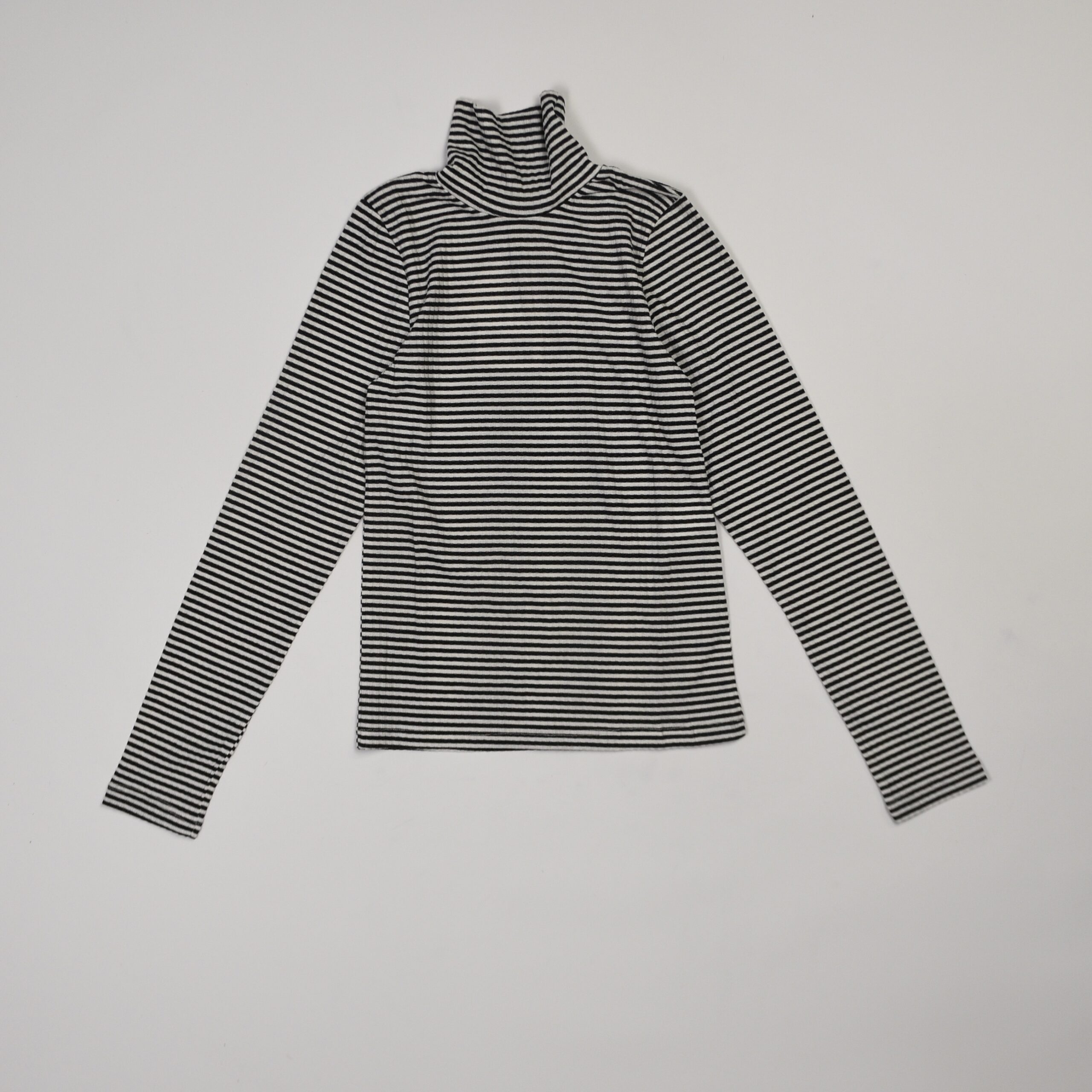 Dolcevita a maniche lunghe in tessuto leggero con fantasia a righe bianche e nere. Modello aderente con collo alto, perfetto per un look essenziale e raffinato.