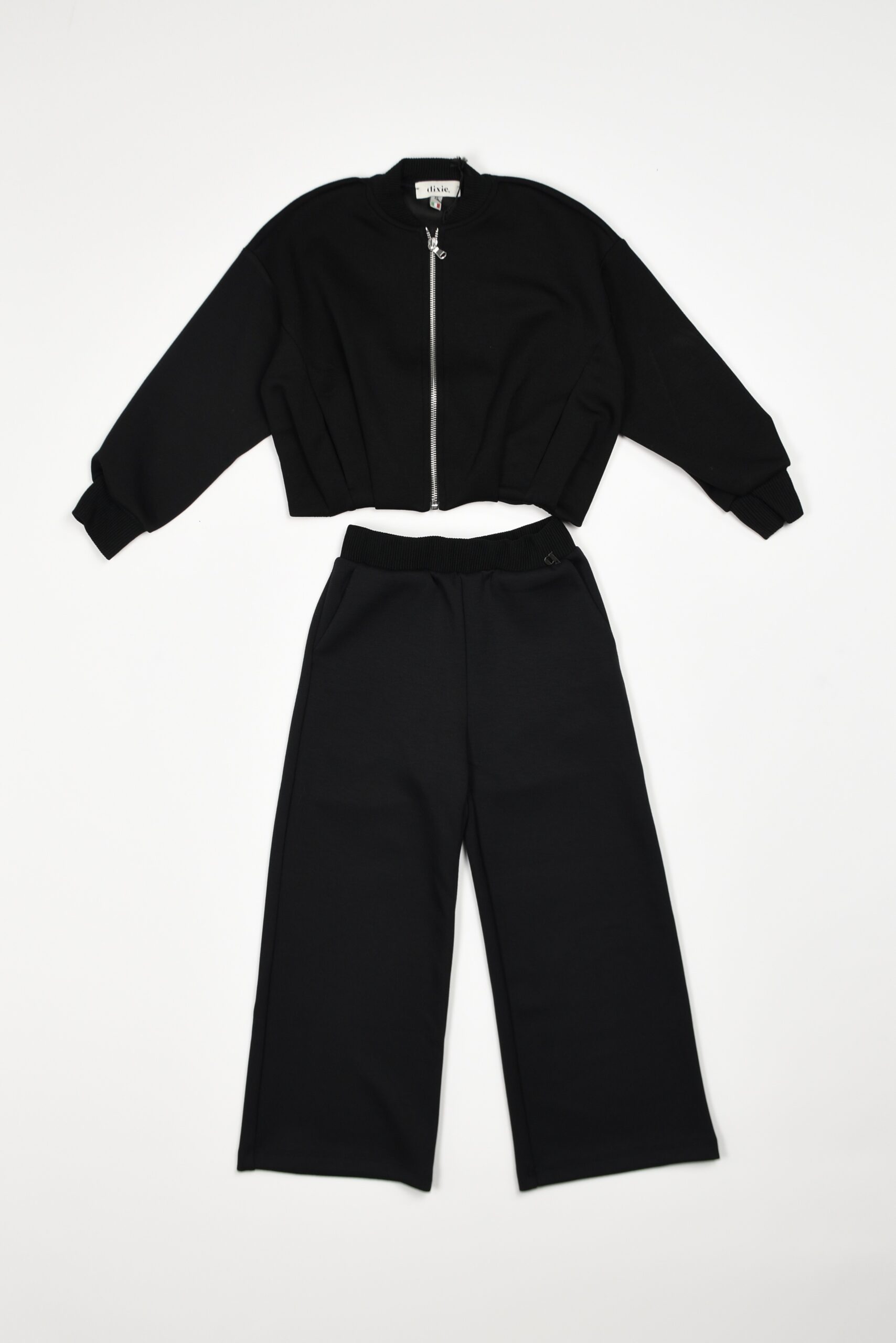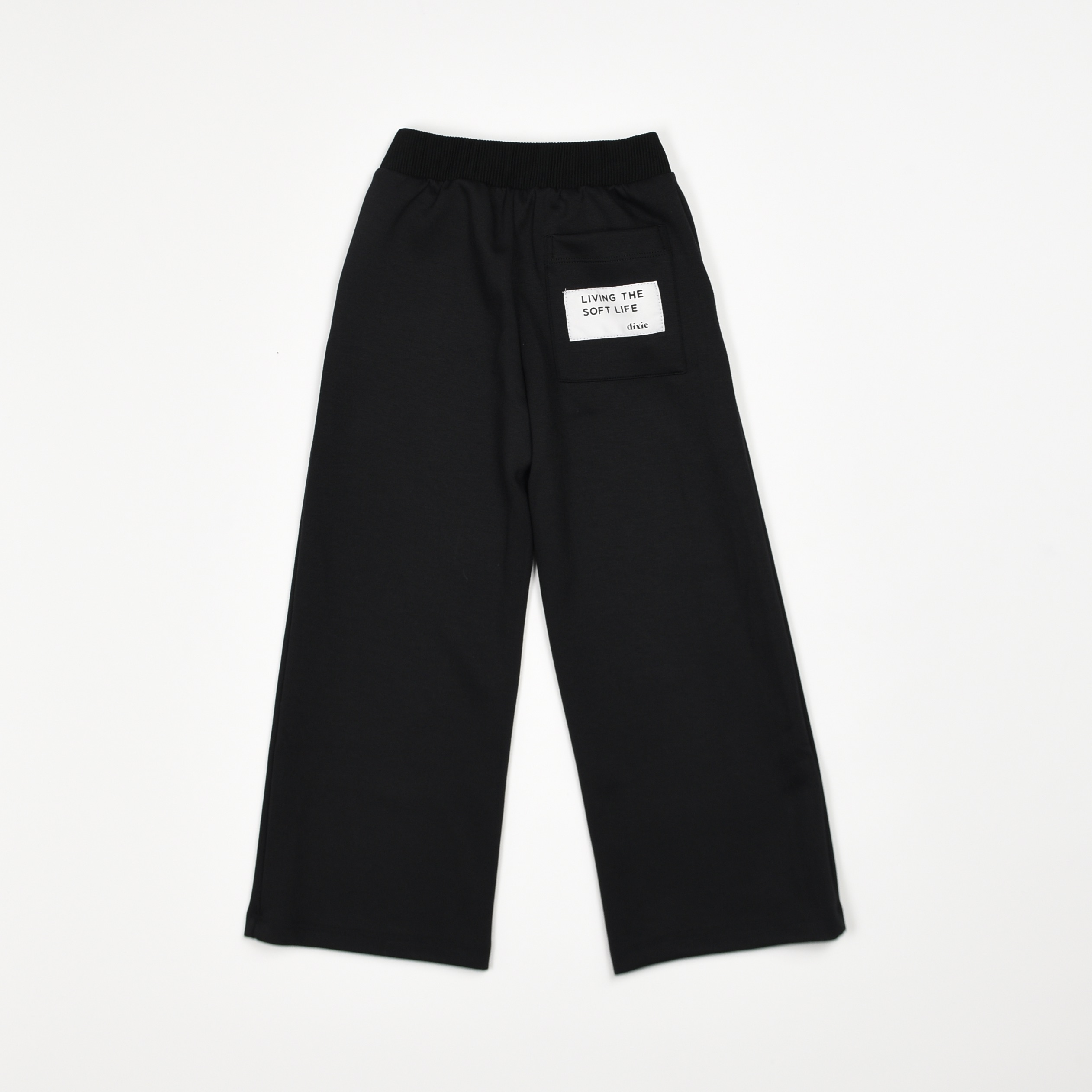 Pantalone Dixie in tessuto morbido, dalla linea dritta e leggermente ampia. La vita è elasticizzata a coste per garantire comfort e praticità, mentre il fronte resta liscio in tinta unita nera. Sul retro è presente una tasca applicata impreziosita da una patch bianca con la scritta “Living the soft life”, dettaglio che dona carattere al capo mantenendo uno stile essenziale e versatile.