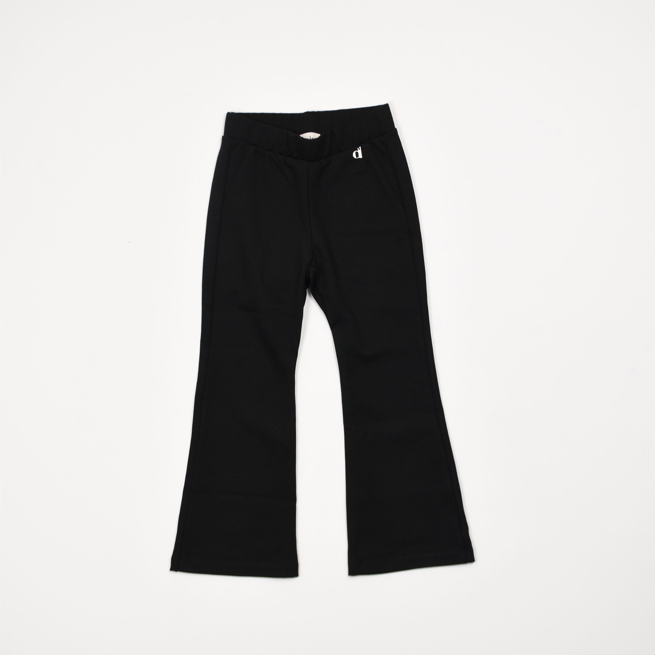 Pantalone Dixie in tessuto nero elasticizzato, dal taglio moderno con gamba leggermente svasata al fondo. Il modello presenta vita comoda con elastico interno e tasche laterali, arricchito dal piccolo dettaglio logato in metallo sul fianco. Un capo essenziale e versatile, perfetto per look pratici ma sempre curati.