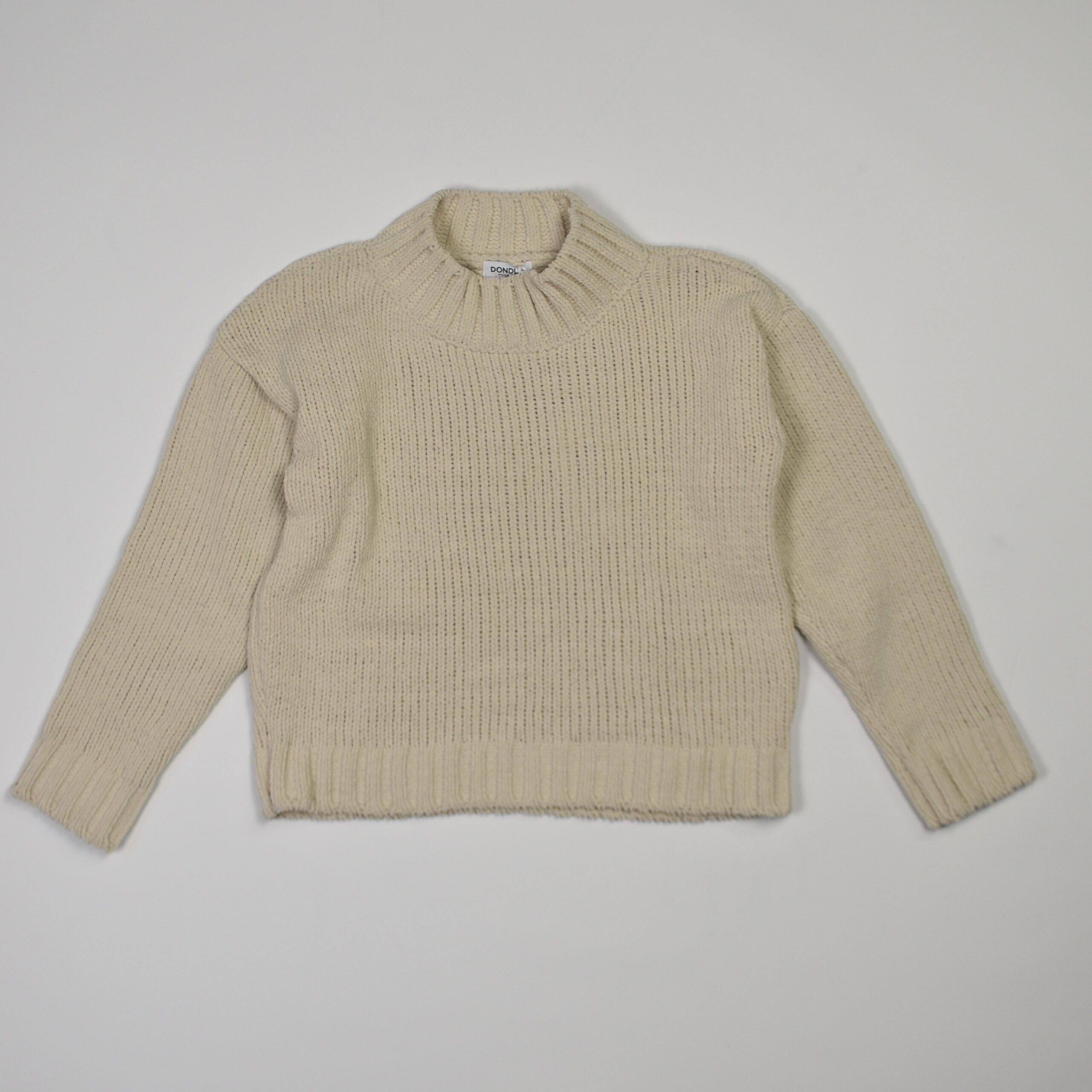 Maglione in lana a coste color beige, caratterizzato da collo alto morbido e linea essenziale. Un capo caldo e versatile, ideale per affrontare la stagione invernale con lo stile minimal ed elegante tipico di Dondup.