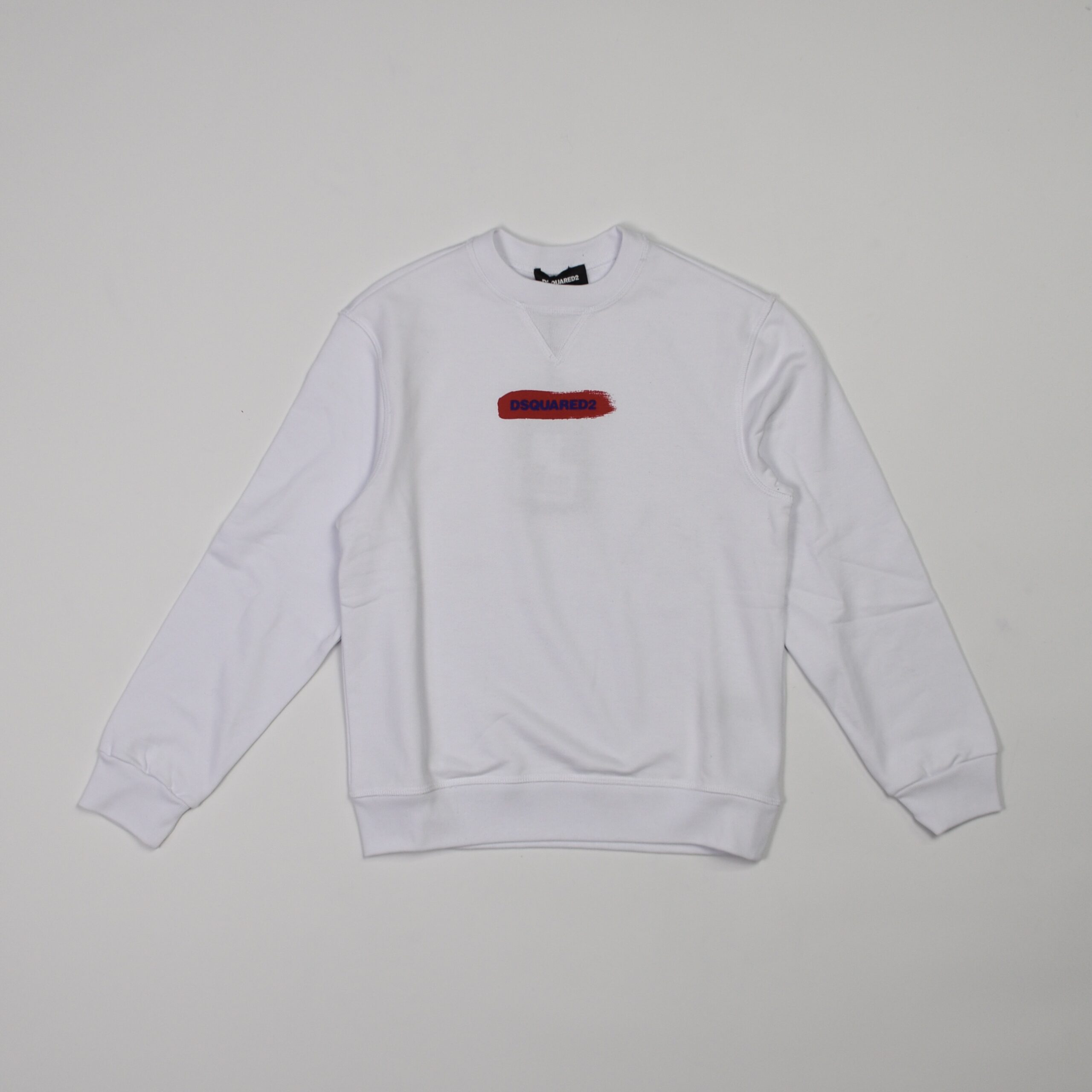Felpa bianca Dsquared2 in cotone, girocollo con maniche lunghe e polsini a costine. Sul davanti applicazione ricamata con logo rosso “Dsquared2”. Fondo rifinito a costine.
