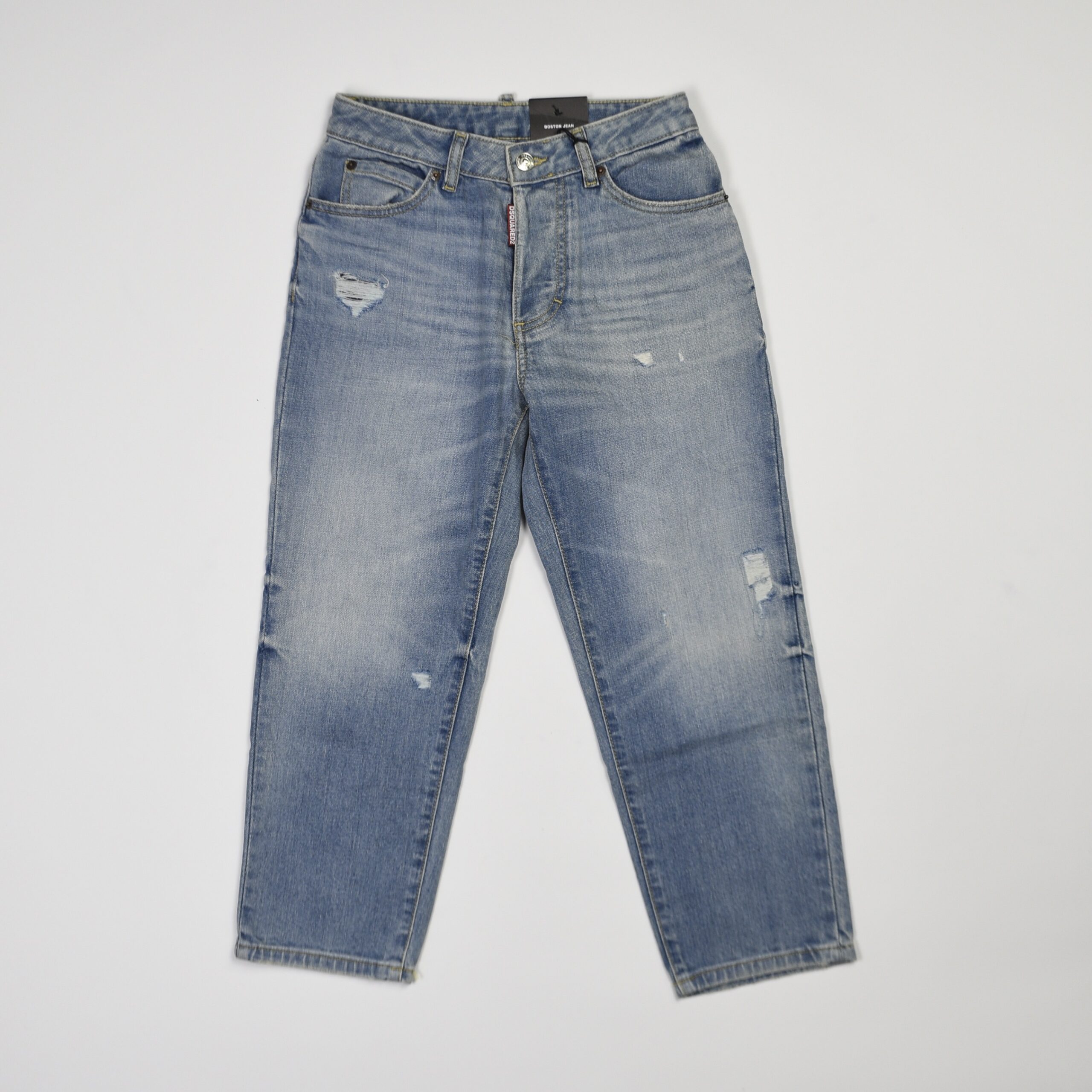 Colore azzurro chiaro délavé con dettagli destroyed e strappi sul fronte per un look grintoso e contemporaneo.