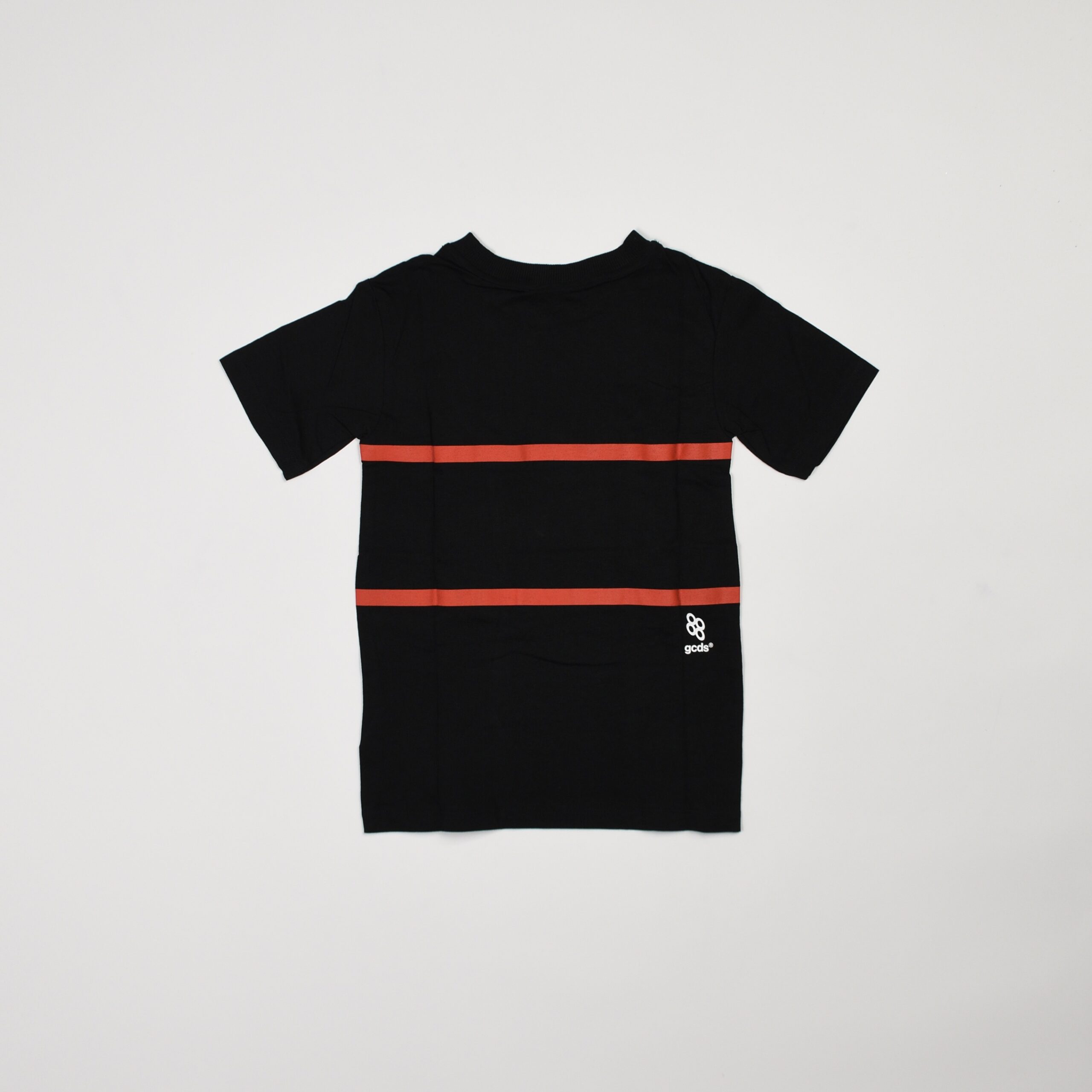T-shirt nera in cotone con girocollo e maniche corte. Presenta due bande orizzontali rosse a contrasto e piccolo logo GCDS bianco sul petto. Vestibilità regolare.