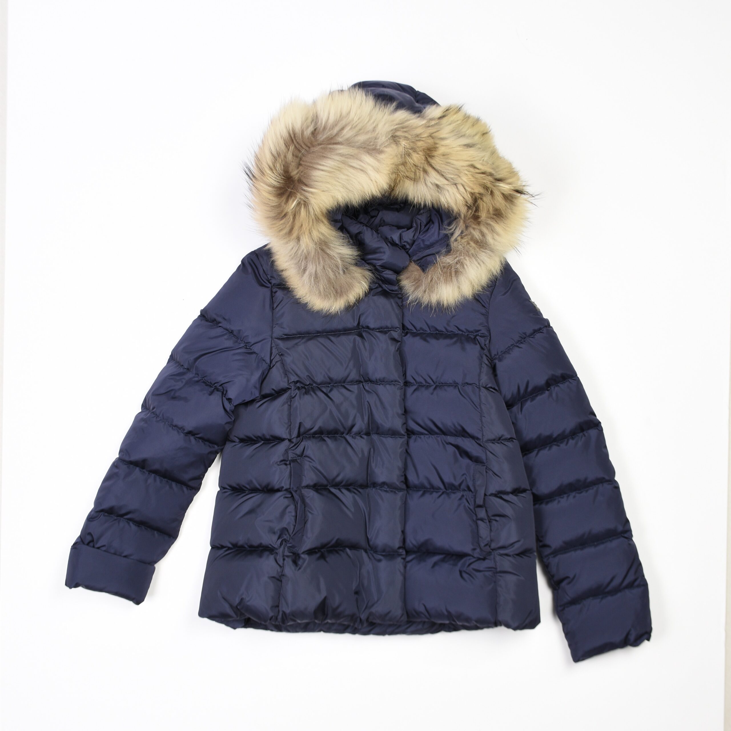 Elegante piumino Il Gufo in nylon lucido blu, con cappuccio impreziosito da bordo in vera pelliccia. Trapuntatura orizzontale, chiusura frontale con zip coperta e tasche laterali. Caldo e confortevole, ideale per affrontare le giornate più fredde con stile e raffinatezza.