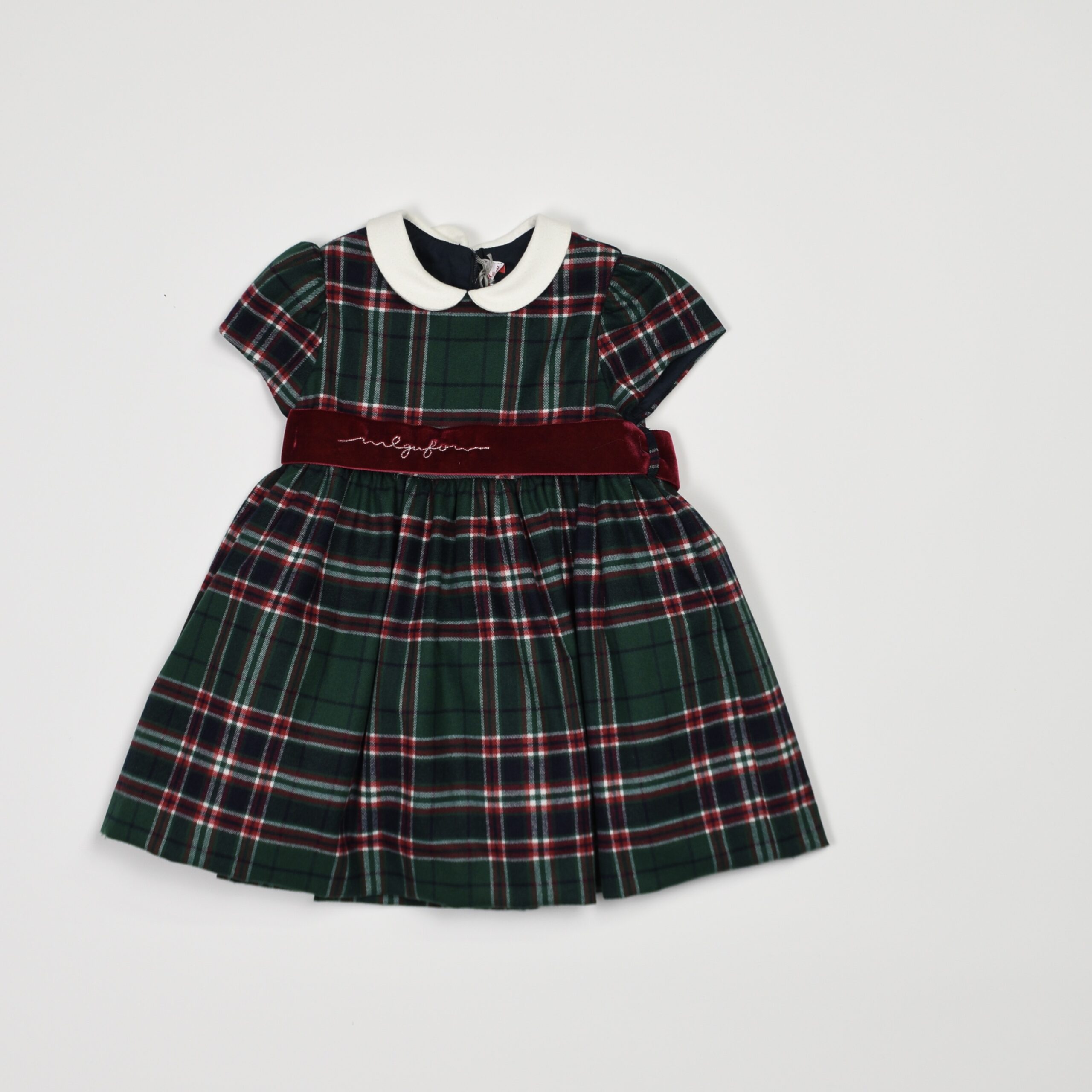 Abito Il Gufo in tessuto scozzese nei toni del verde, rosso e blu. Presenta colletto bianco a contrasto, maniche corte e cintura in velluto bordeaux con logo ricamato.Taglio svasato con pieghe morbide, perfetto per occasioni speciali e festività.