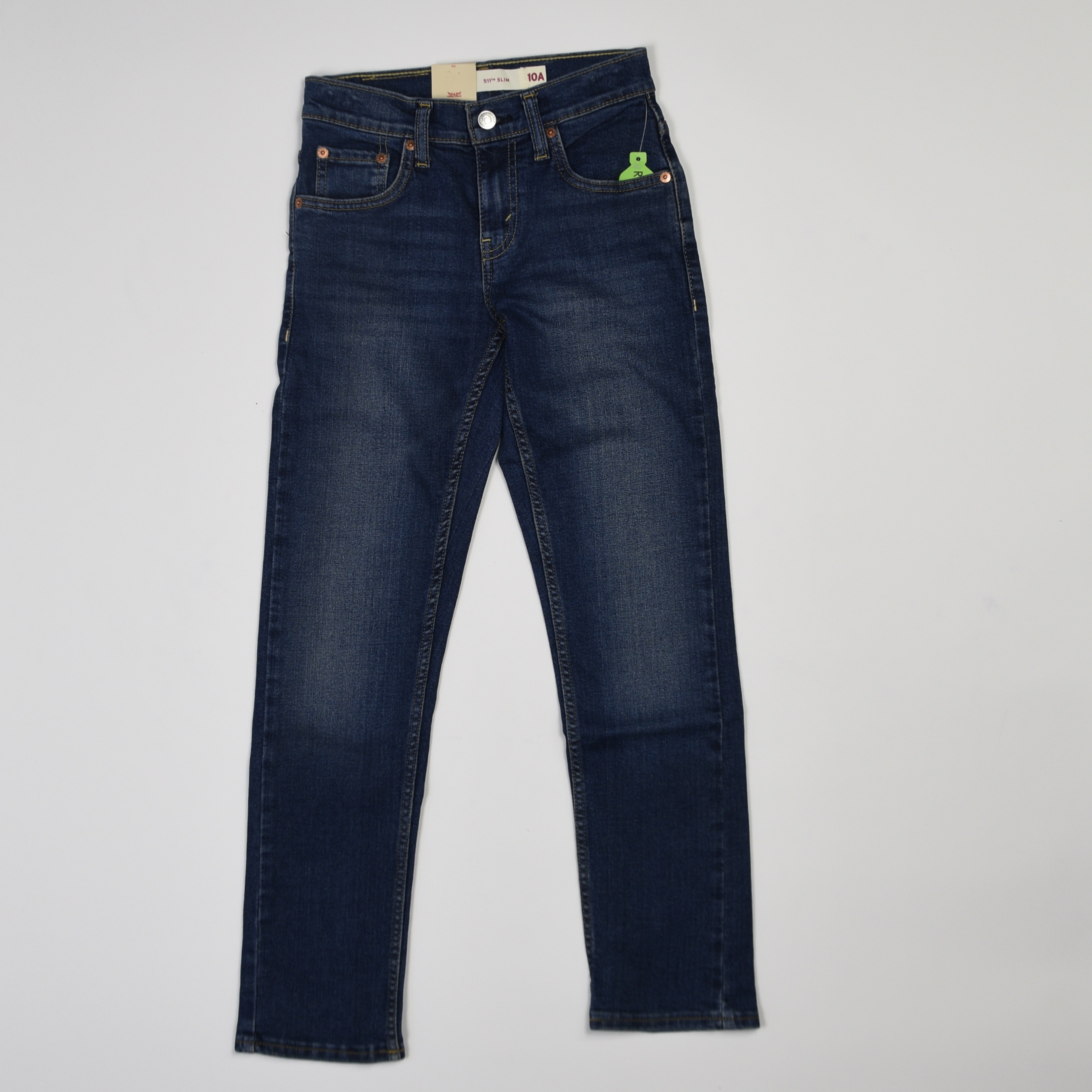 Classico denim firmato Levi’s, in lavaggio blu medio con leggere sfumature délavé sul davanti e sul retro. Modello a cinque tasche con chiusura con bottone e zip, passanti per cintura e dettaglio iconico con etichetta laterale logata.
